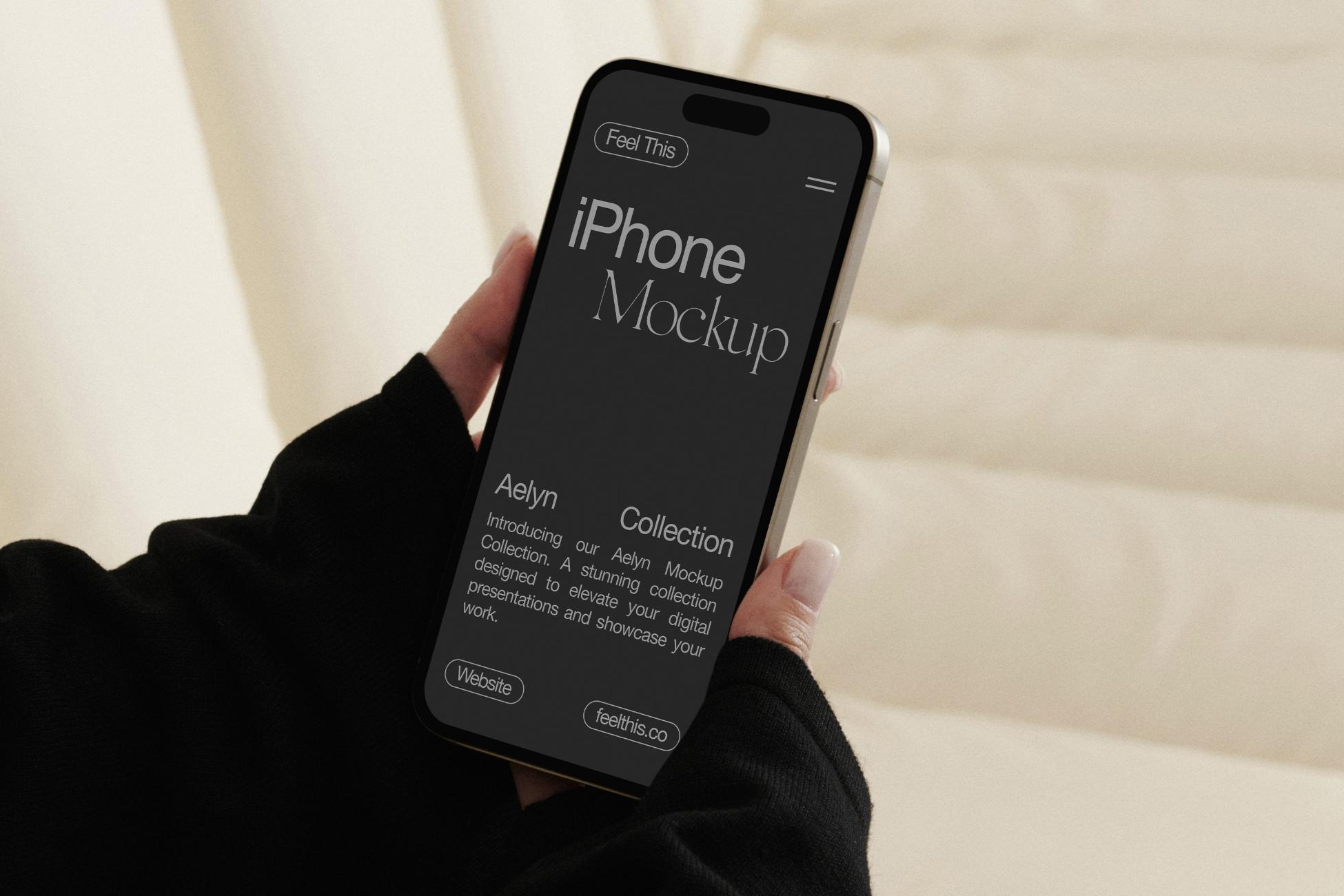Effortlessly elevate your designs with our stunning iPhone in hand mockup. Imagine your app or website displayed on a sleek iPhone held in a relaxed hand, all bathed in a calming beige tone.