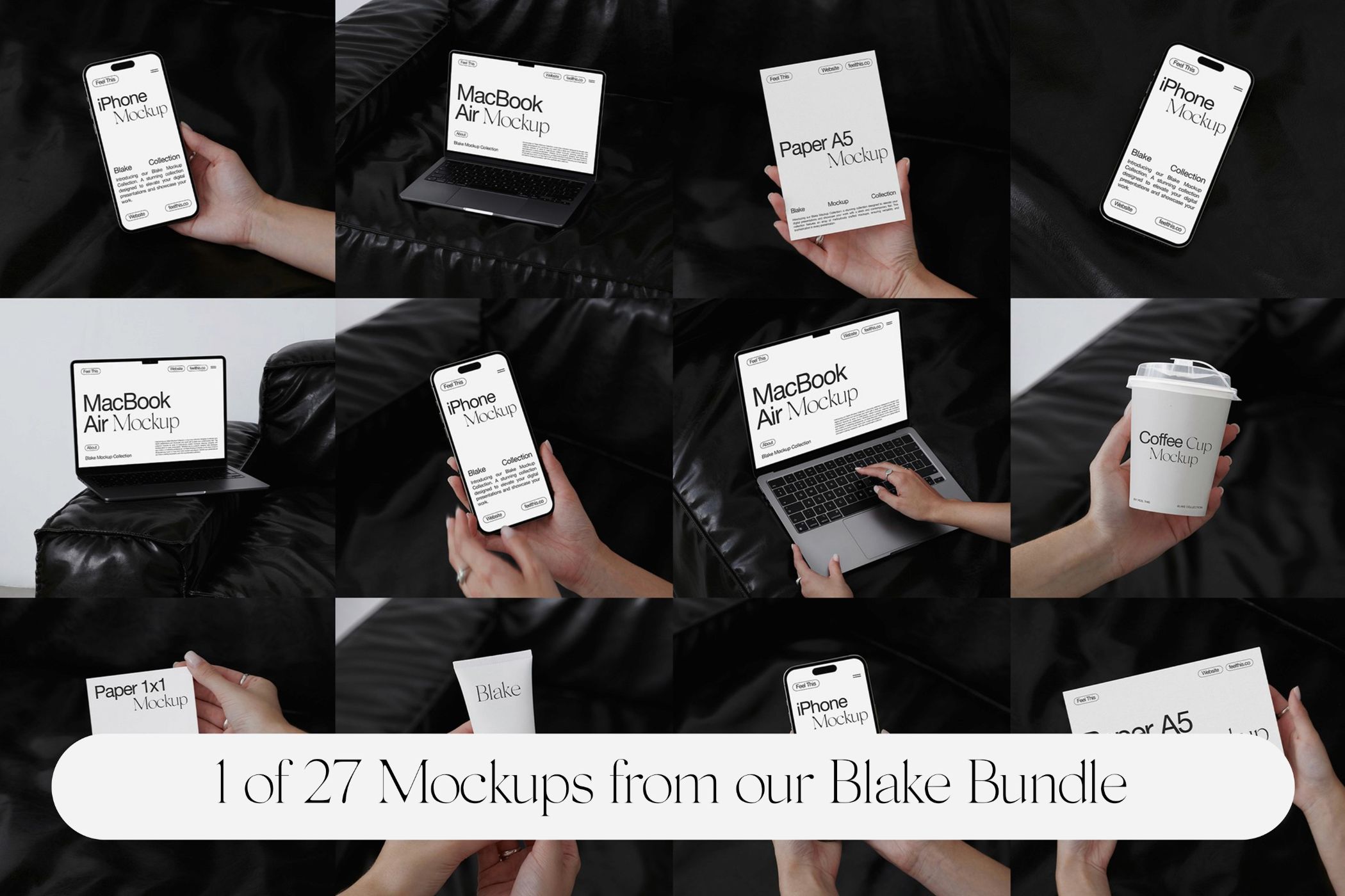 This free mockup is part of Blake Mockup Bundle, which includes 27 mockups featuring iPhones, MacBooks, posters, flyers, frames, coffee cups, and cosmetics in various styles.