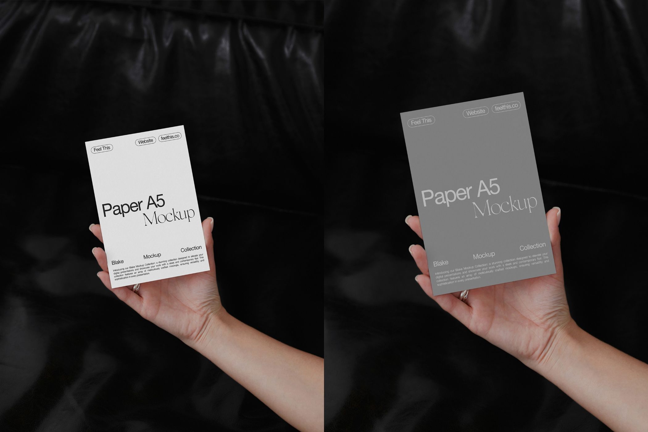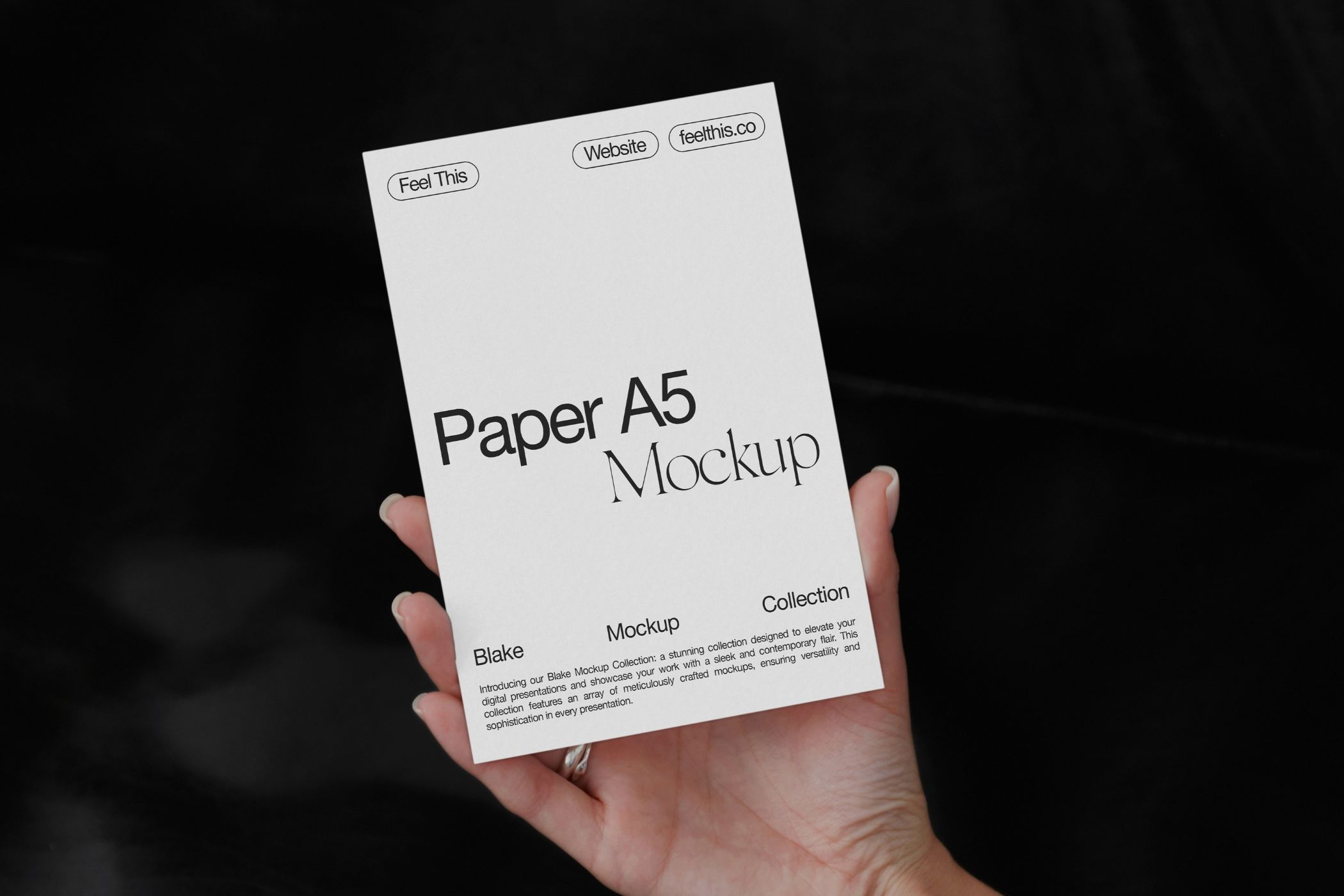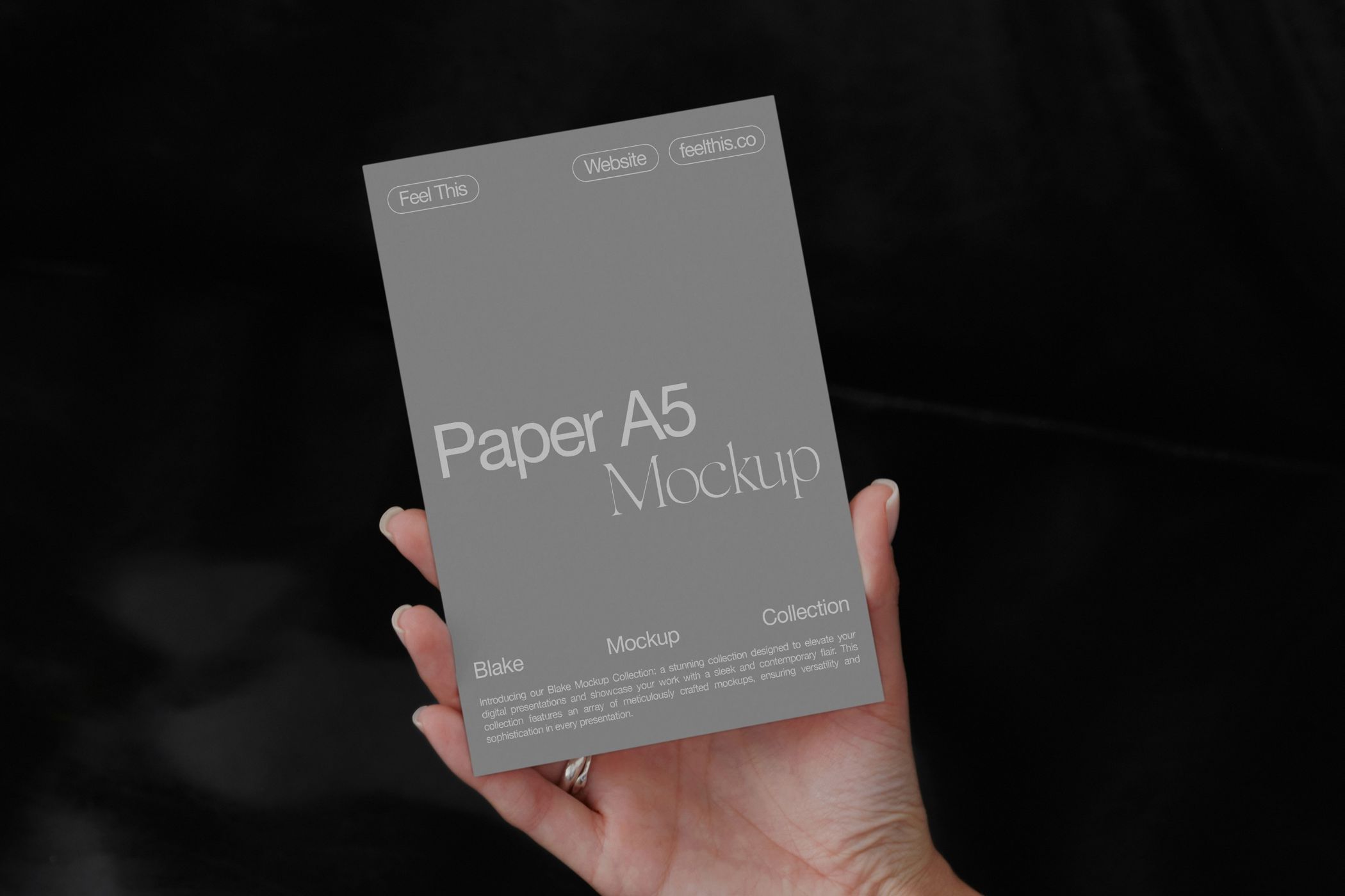 Elevate your flyer designs with this sophisticated A5 mockup. Featuring a dark background and a woman's hand holding the flyer, this editable Photoshop template offers a minimalist and professional look. Customize the flyer's content, colors,and design to showcase your brand or message effectively.
