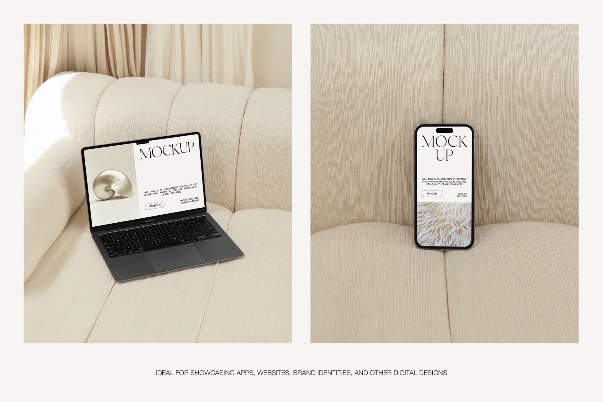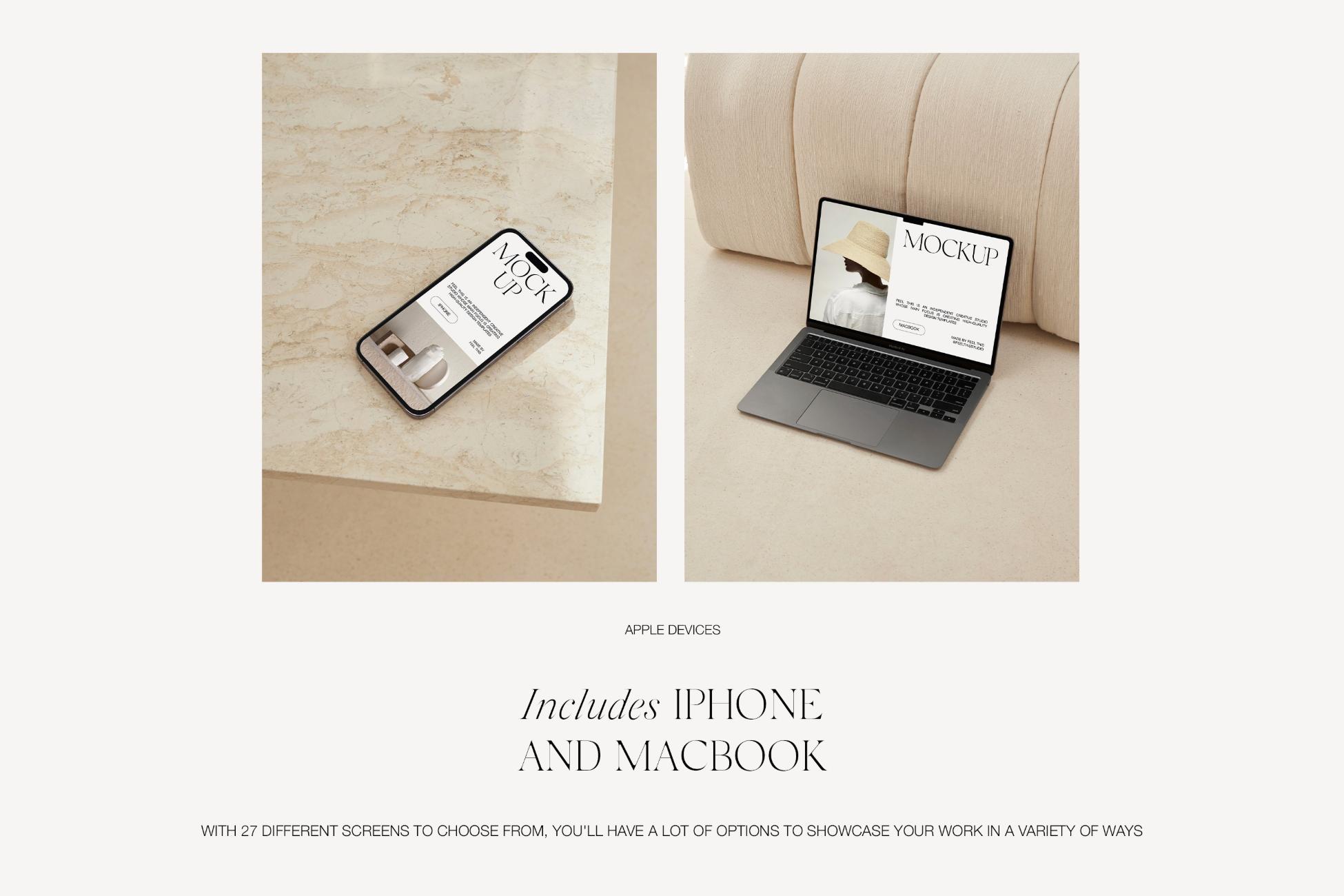 Elara is a collection of 27 customizable iPhone 14 Pro & MacBook Air mockups for Adobe Photoshop.