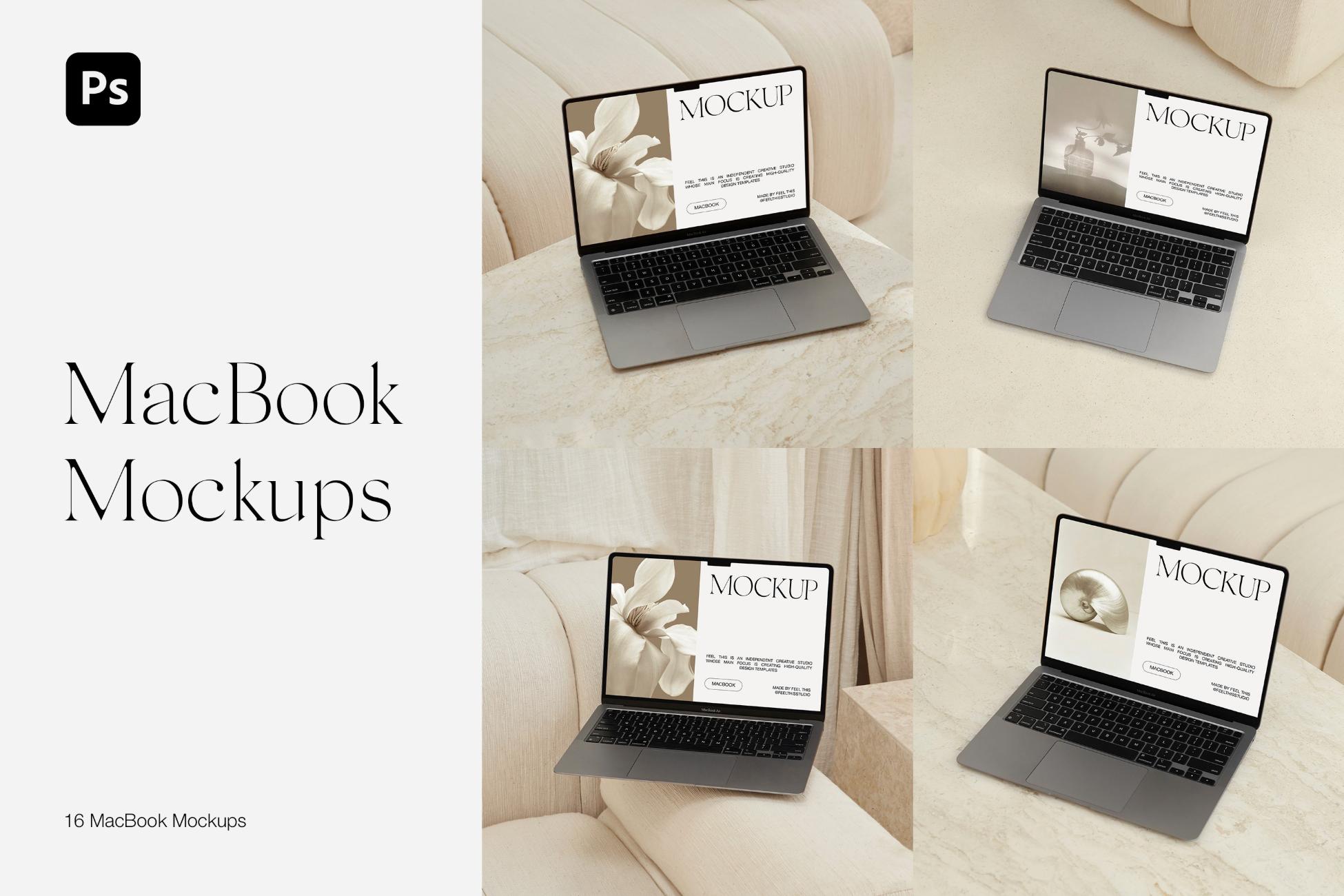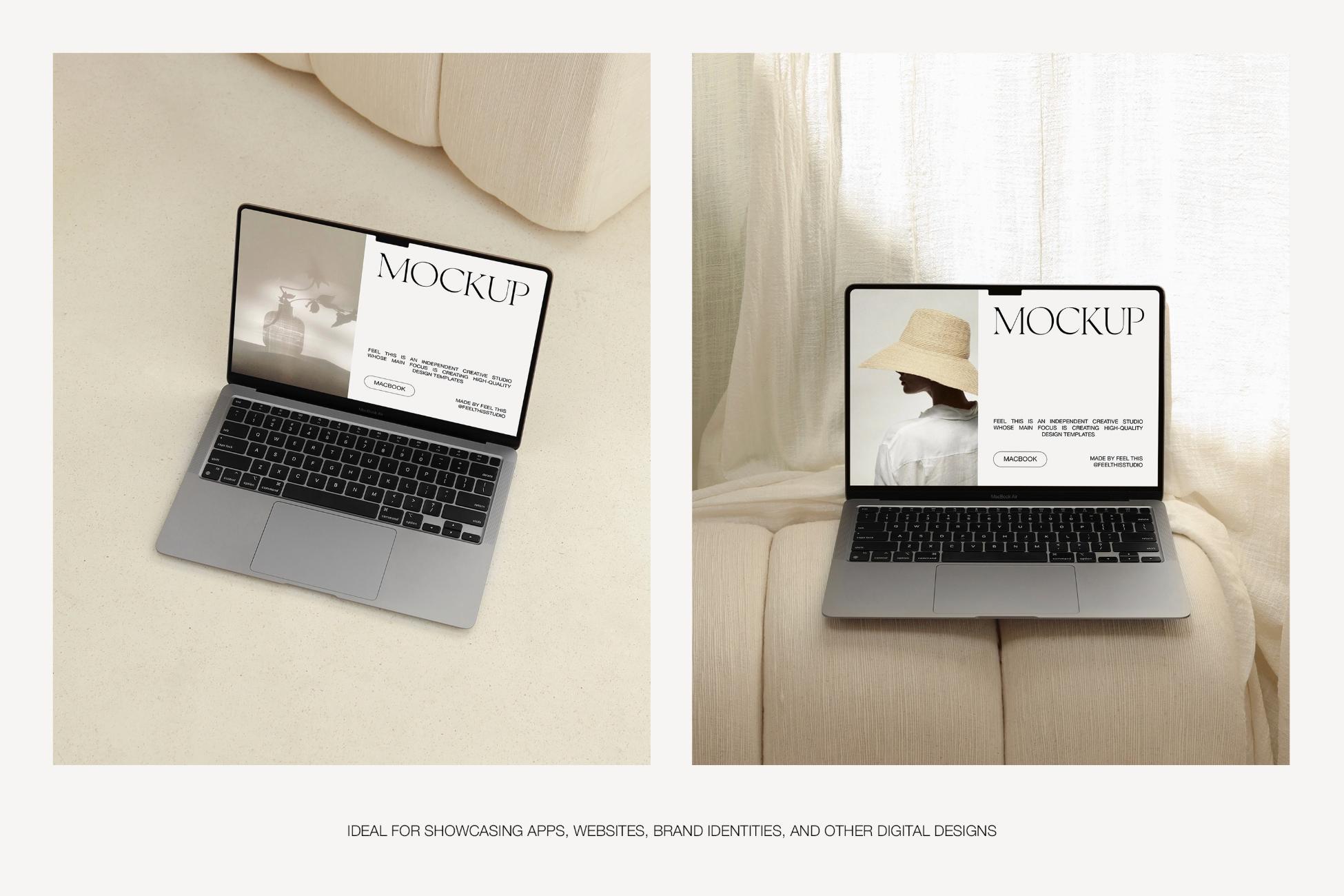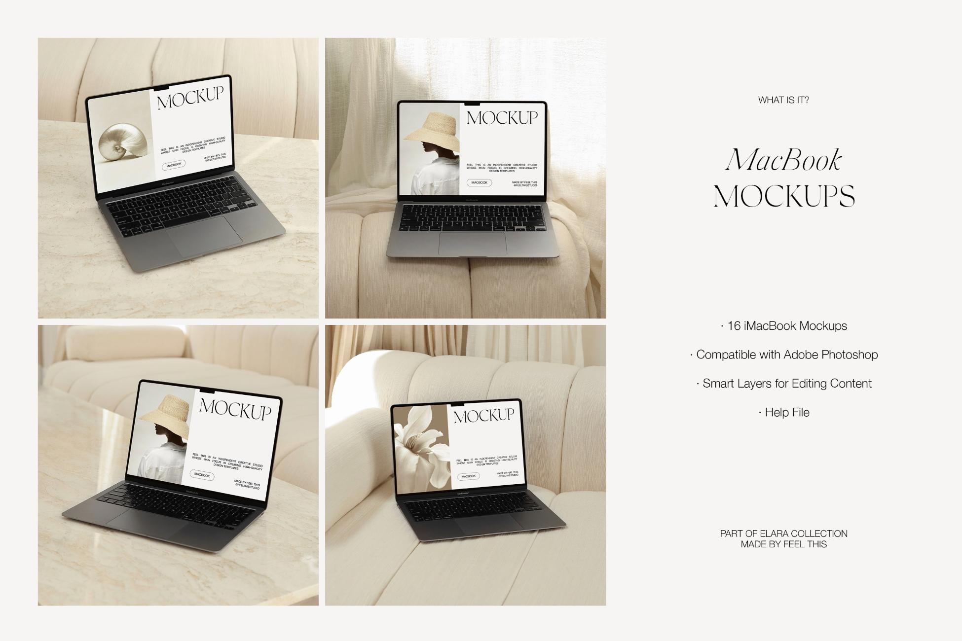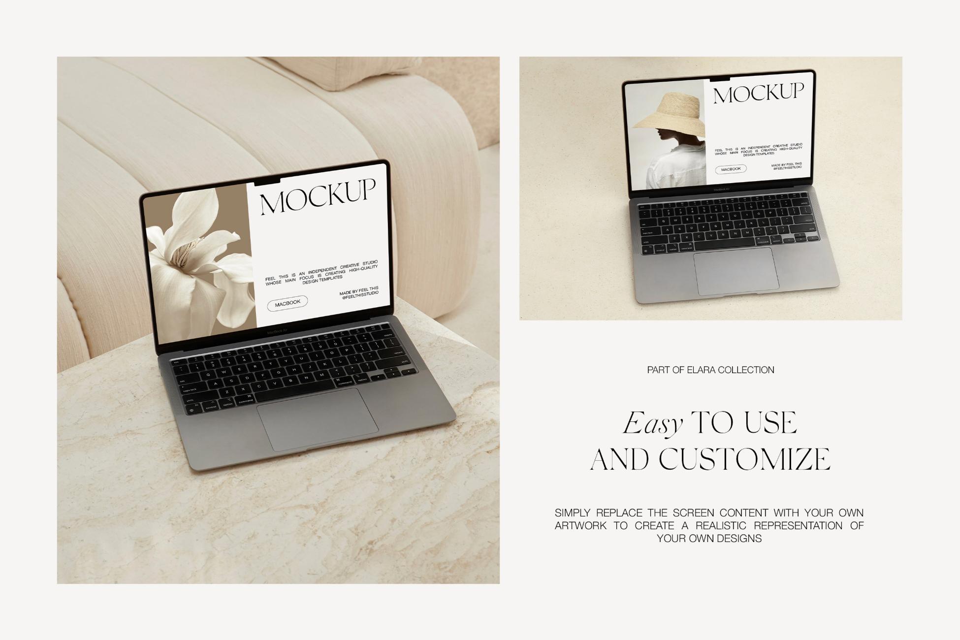 These MacBook Air mockups for Adobe Photoshop are part of the Elara Collection, featuring a variety of aesthetic and elegant mockups for showcasing your designs. A meticulously curated set of 16 aesthetically pleasing and elegantly designed mockups that will elevate your presentations, designs, and projects to a whole new level of sophistication. Whether you're a graphic designer, web developer, or simply someone who appreciates beauty and finesse, this collection is perfect for showcasing your work in a captivating and professional manner.