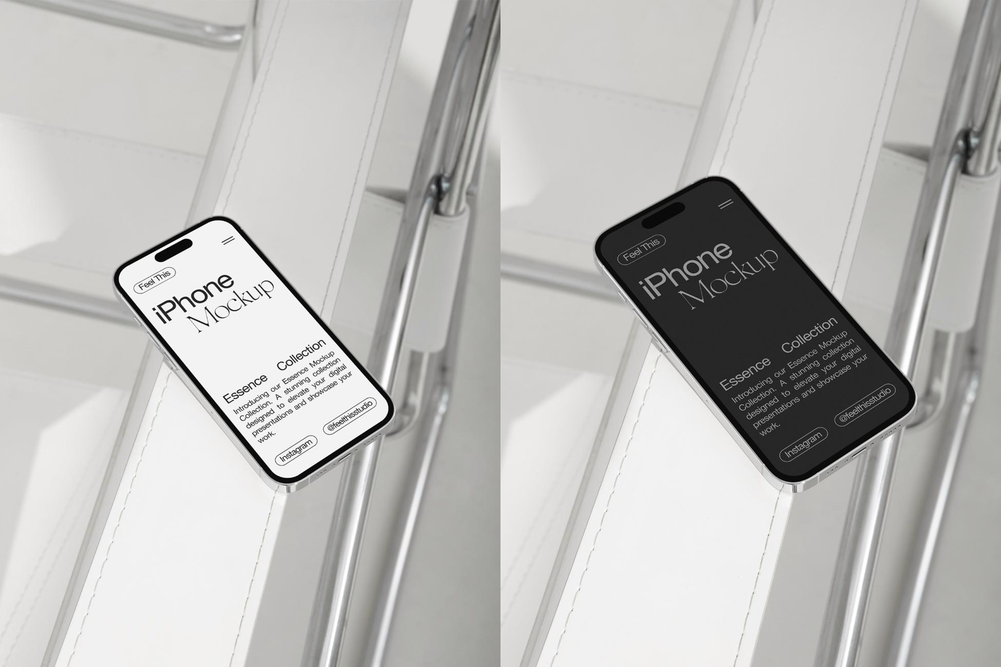 This iPhone mockup is part of Essence Mockup Bundle, which includes 19 mockups of iPhones, MacBooks, Stationery, & Tote Bags in various styles.
