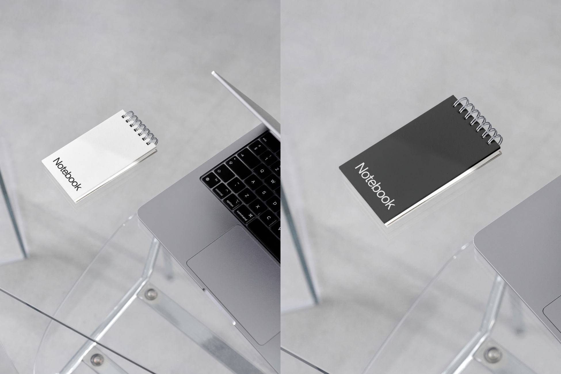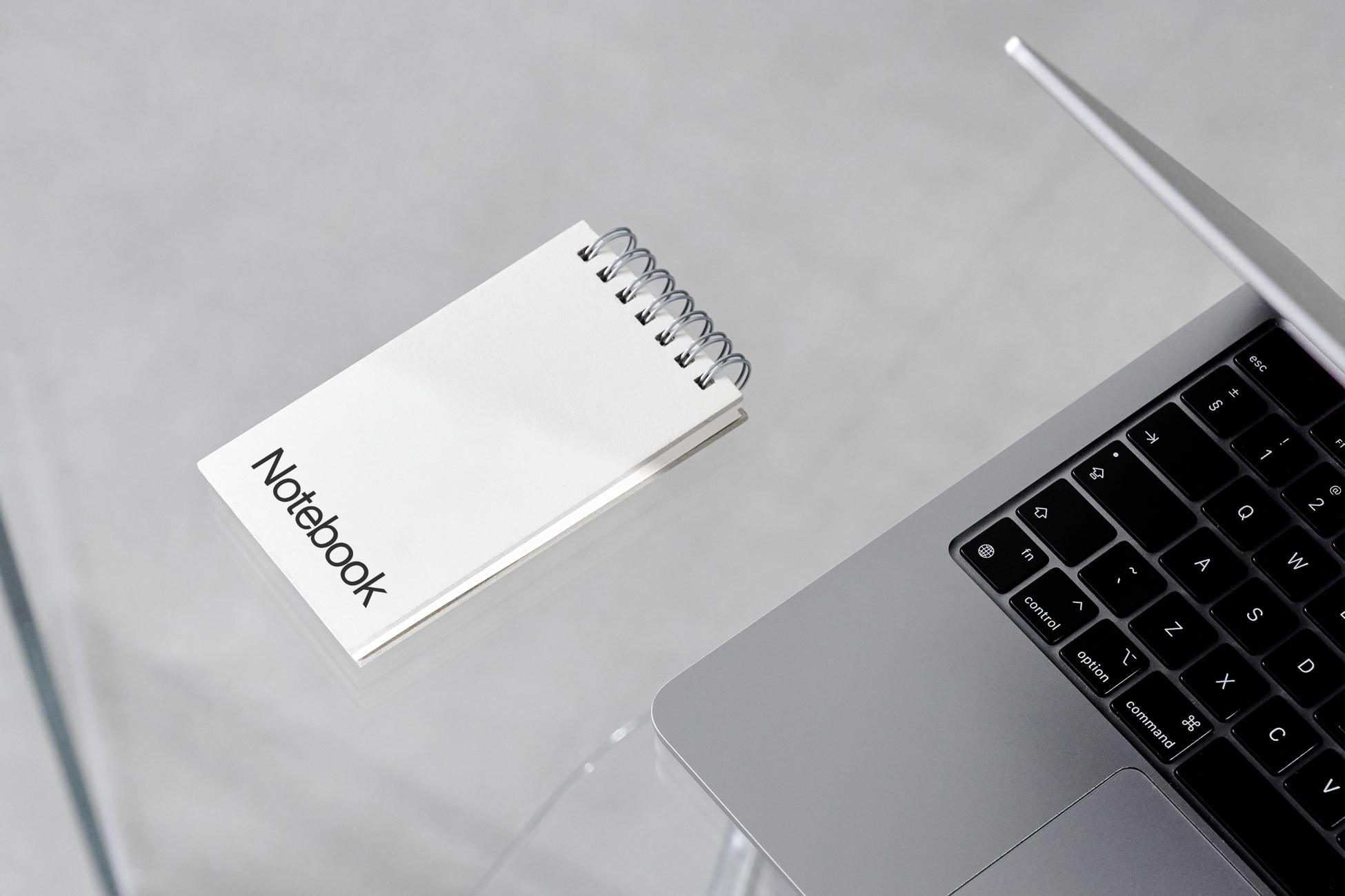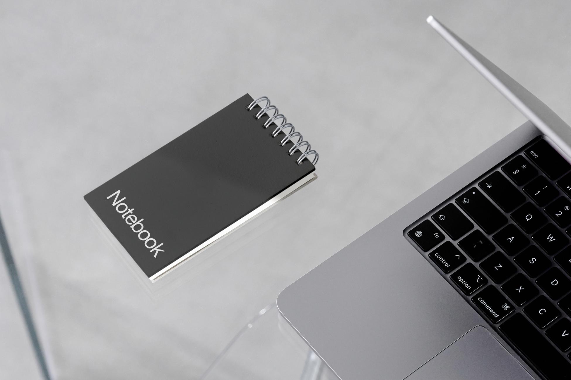This mockup showcases a sleek and minimalist notebook. Perfect for designers, illustrators, and creative professionals looking to display their notebook covers, layouts, or branding in a professional and contemporary setting.