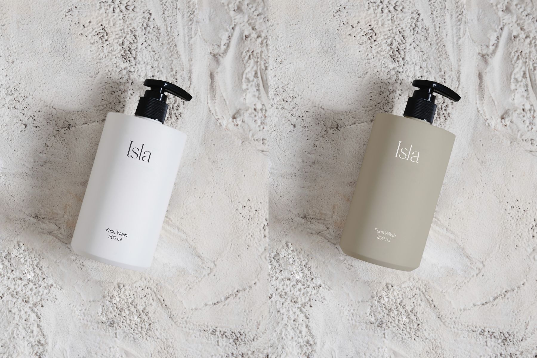 This cosmetic bottle mockup is part of the Isla Mockup Bundle, which includes 18 mockups featuring iPhones, iPads, MacBooks, hand cream tubes, droppers, cosmetic boxes, face wash bottles, and facial sheet masks.