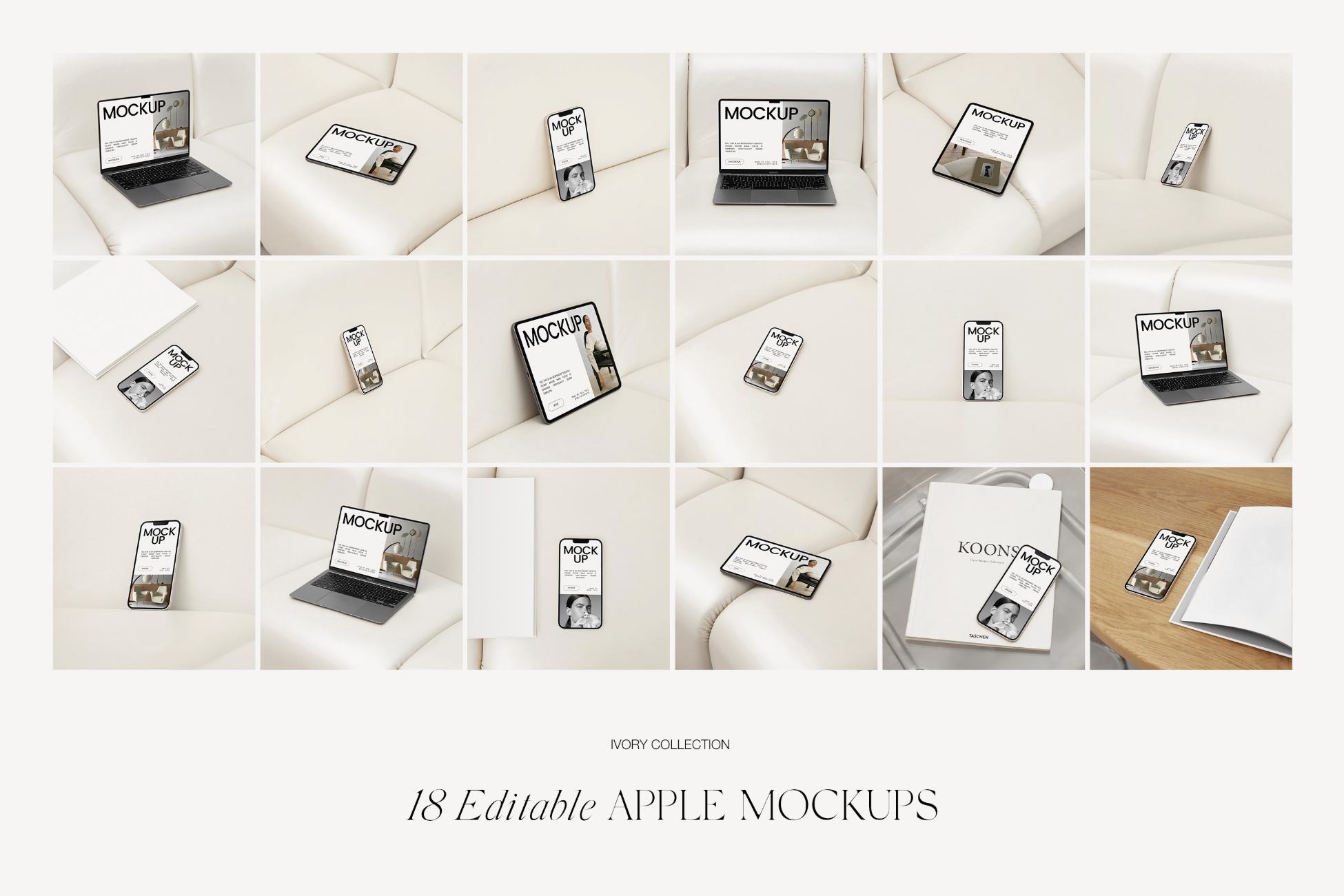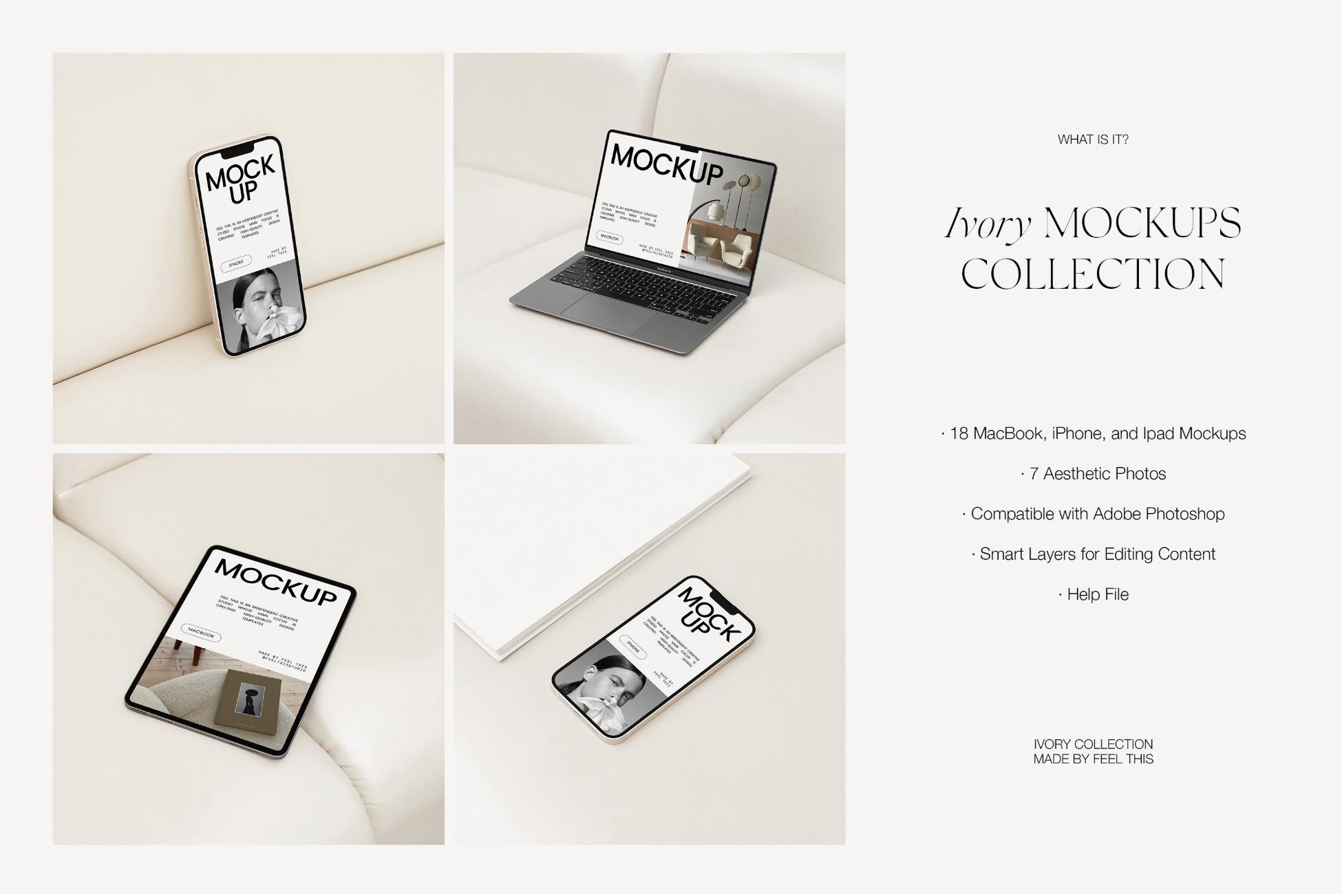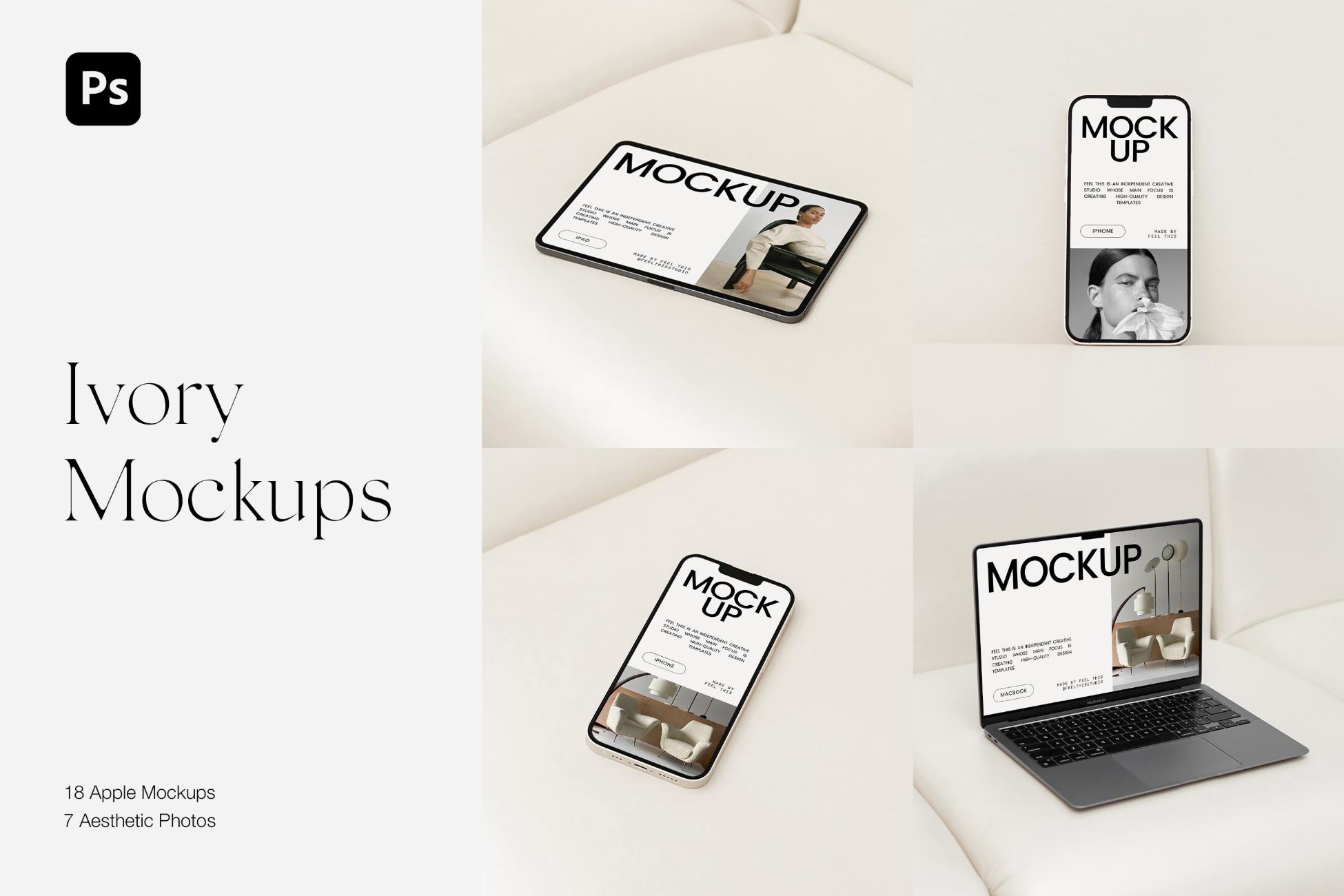 Ivory is a collection of 18 customizable MacBook, iPhone, and iPad mockups for Adobe Photoshop. Also, Ivory includes 7 beautiful and aesthetic photos.