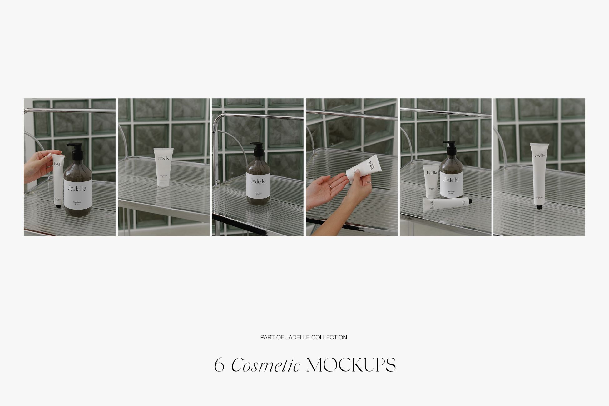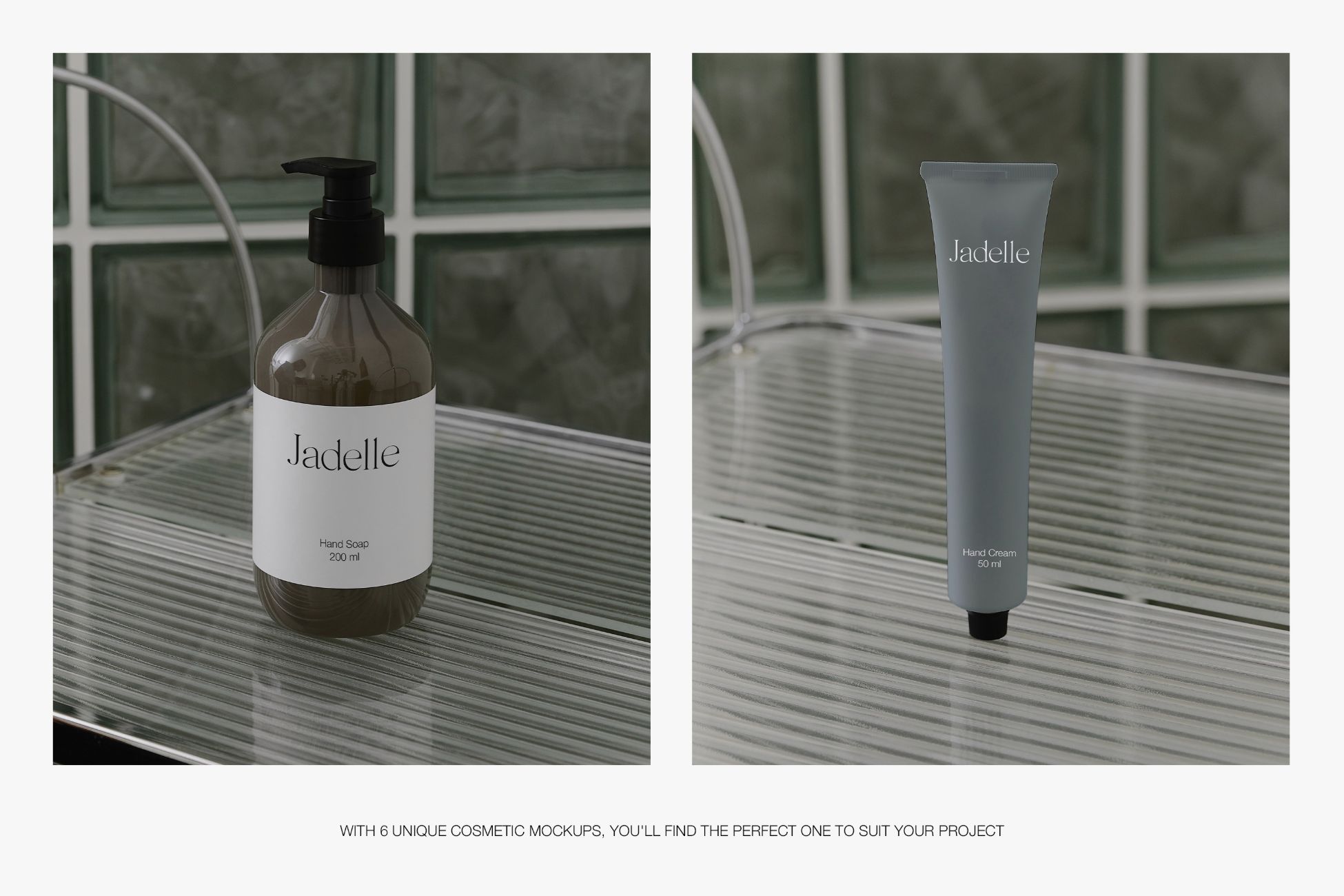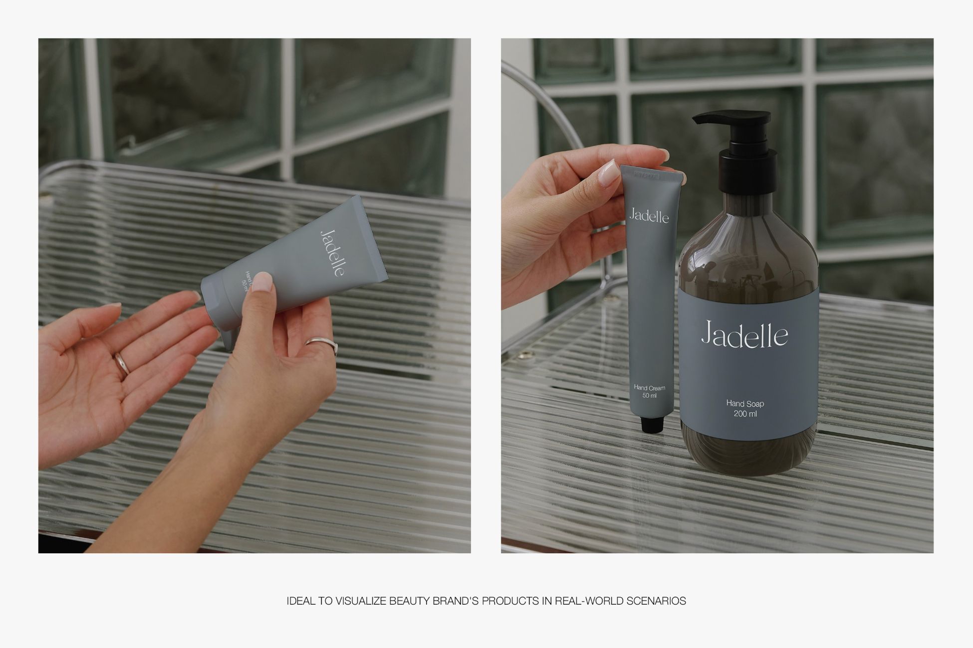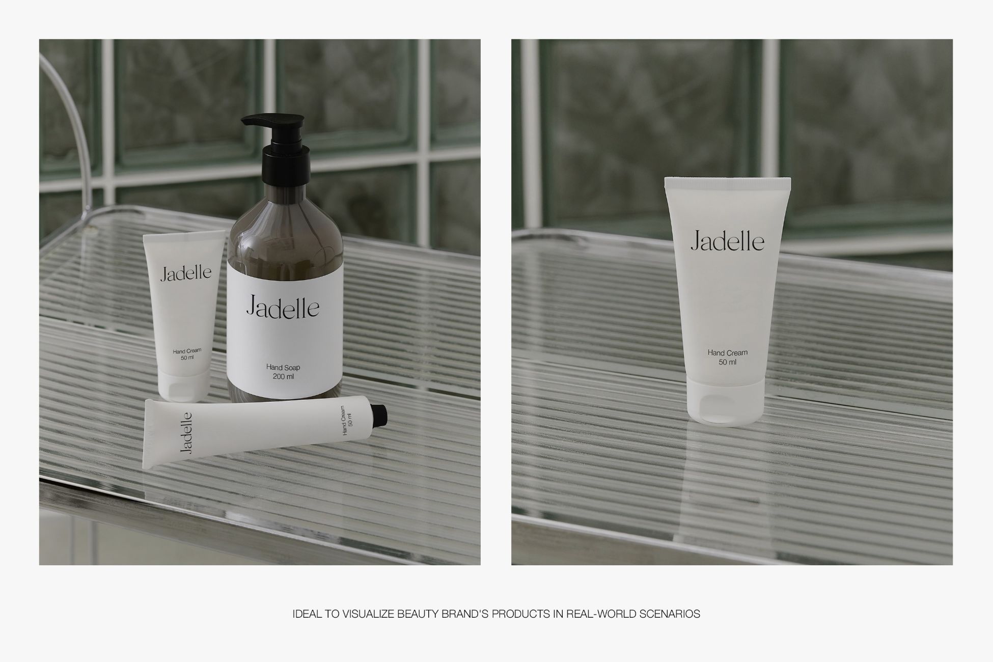 Showcase your cosmetic and skincare branding with the Jadelle Cosmetic Mockup Collection, featuring hand cream tube and cosmetic bottle mockups in a modern, minimalist bathroom interior. Designed for beauty brands, skincare packaging, and luxury product presentations, these high-quality PSD mockups offer a clean, refined aesthetic to elevate your designs.