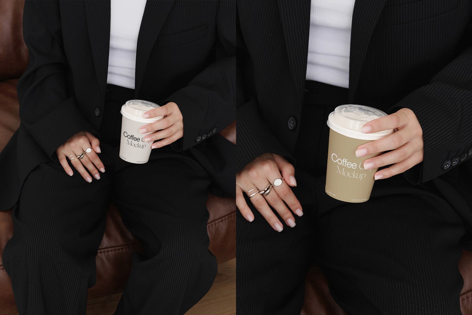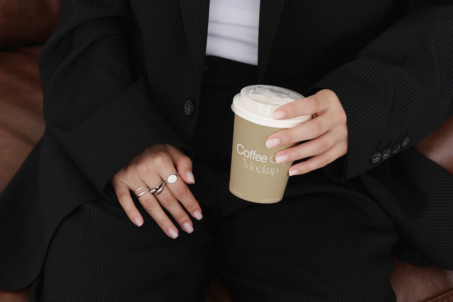 A high-quality, customizable coffee cup in woman hand mockup for Photoshop.