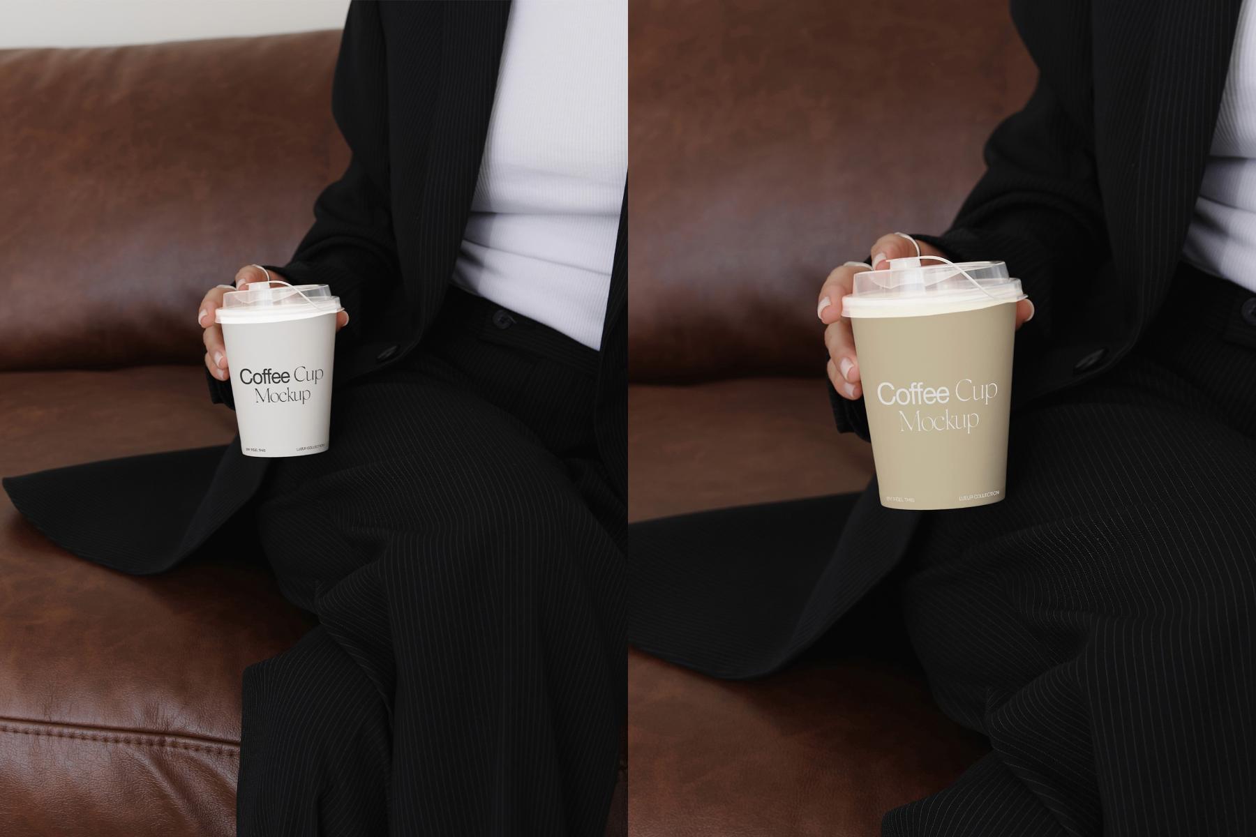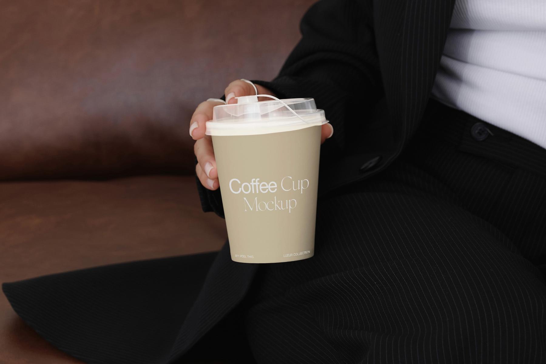 A high-quality, customizable coffee cup in woman hand mockup for Photoshop.