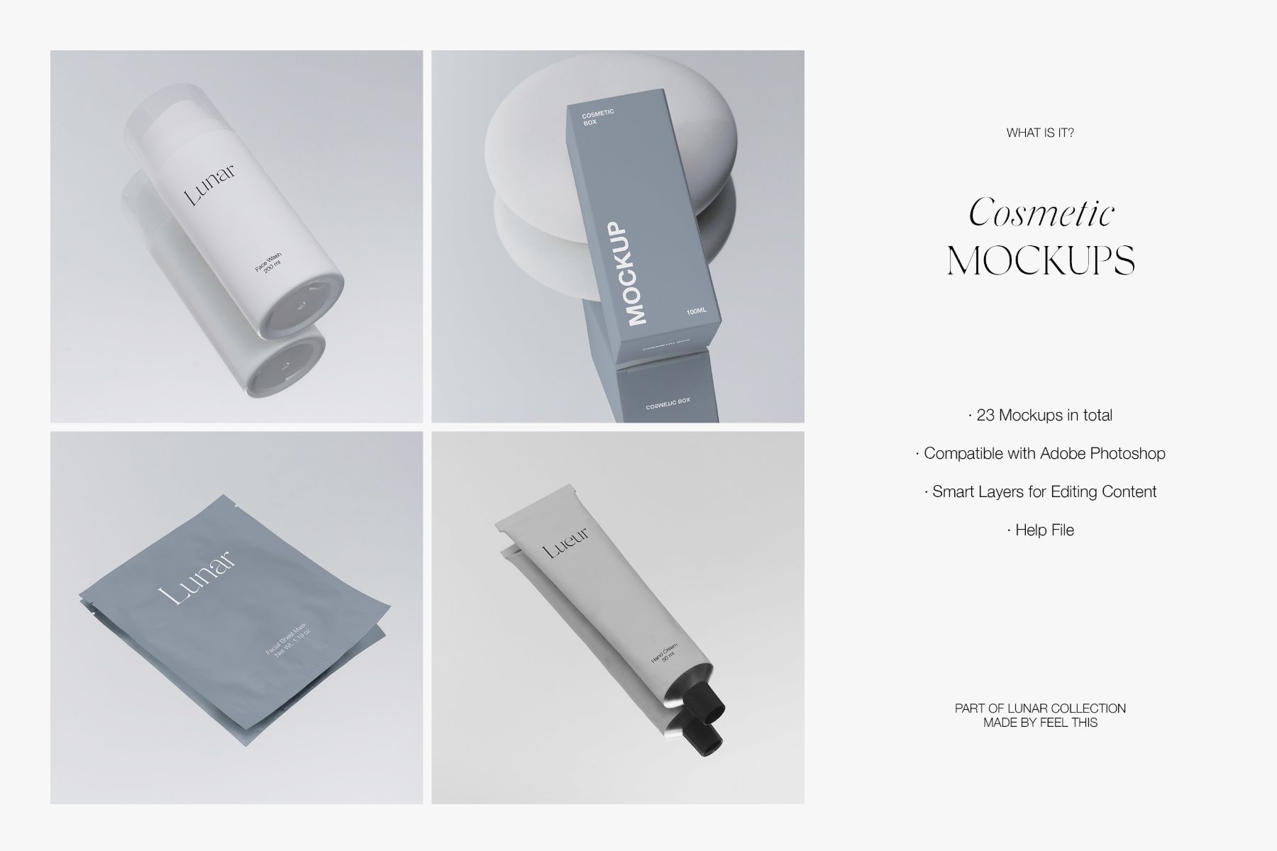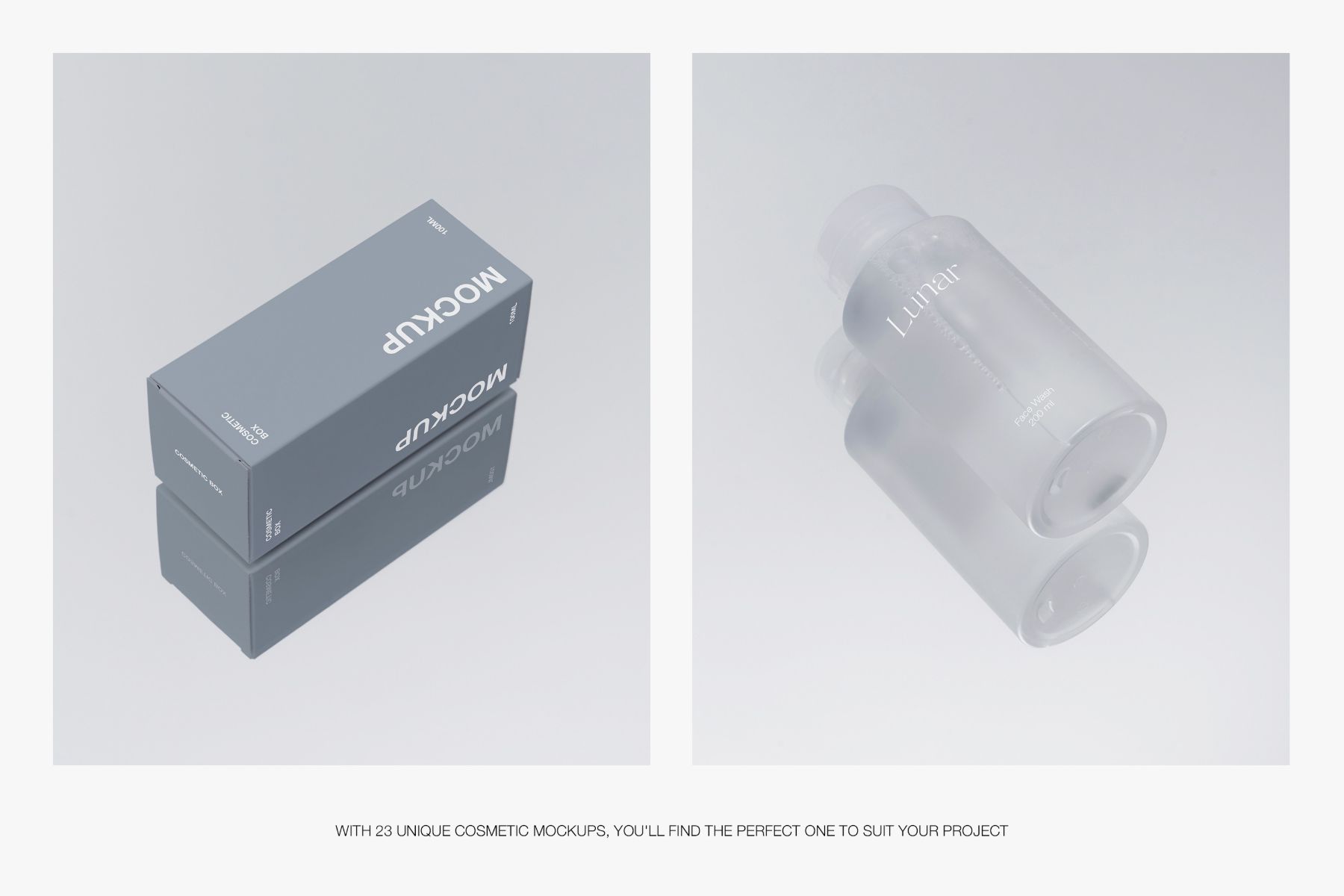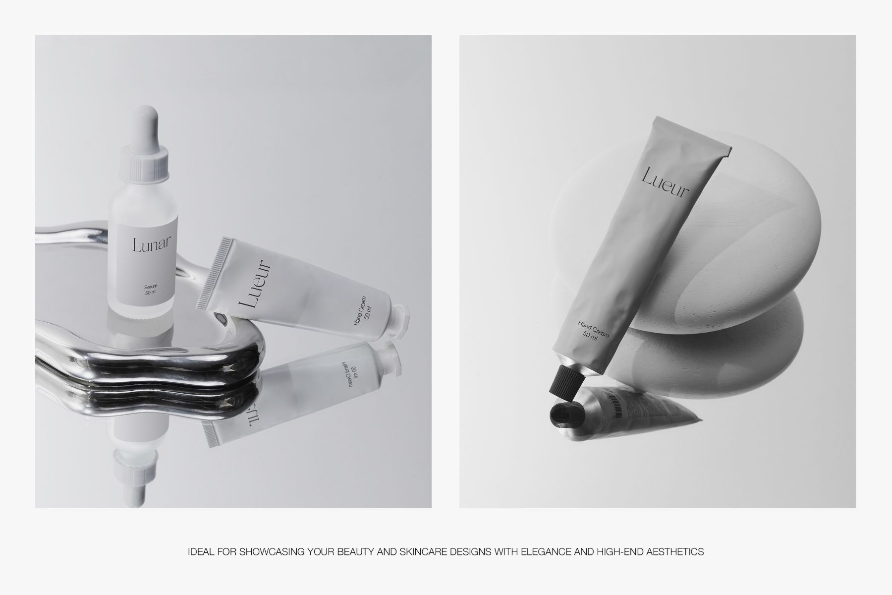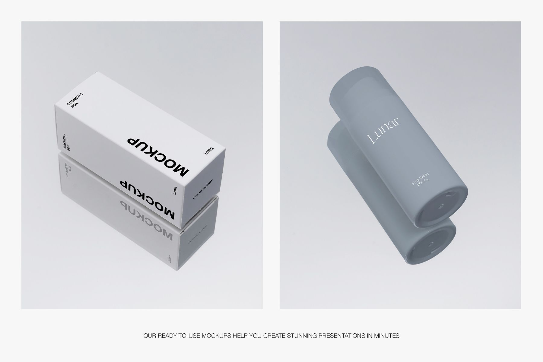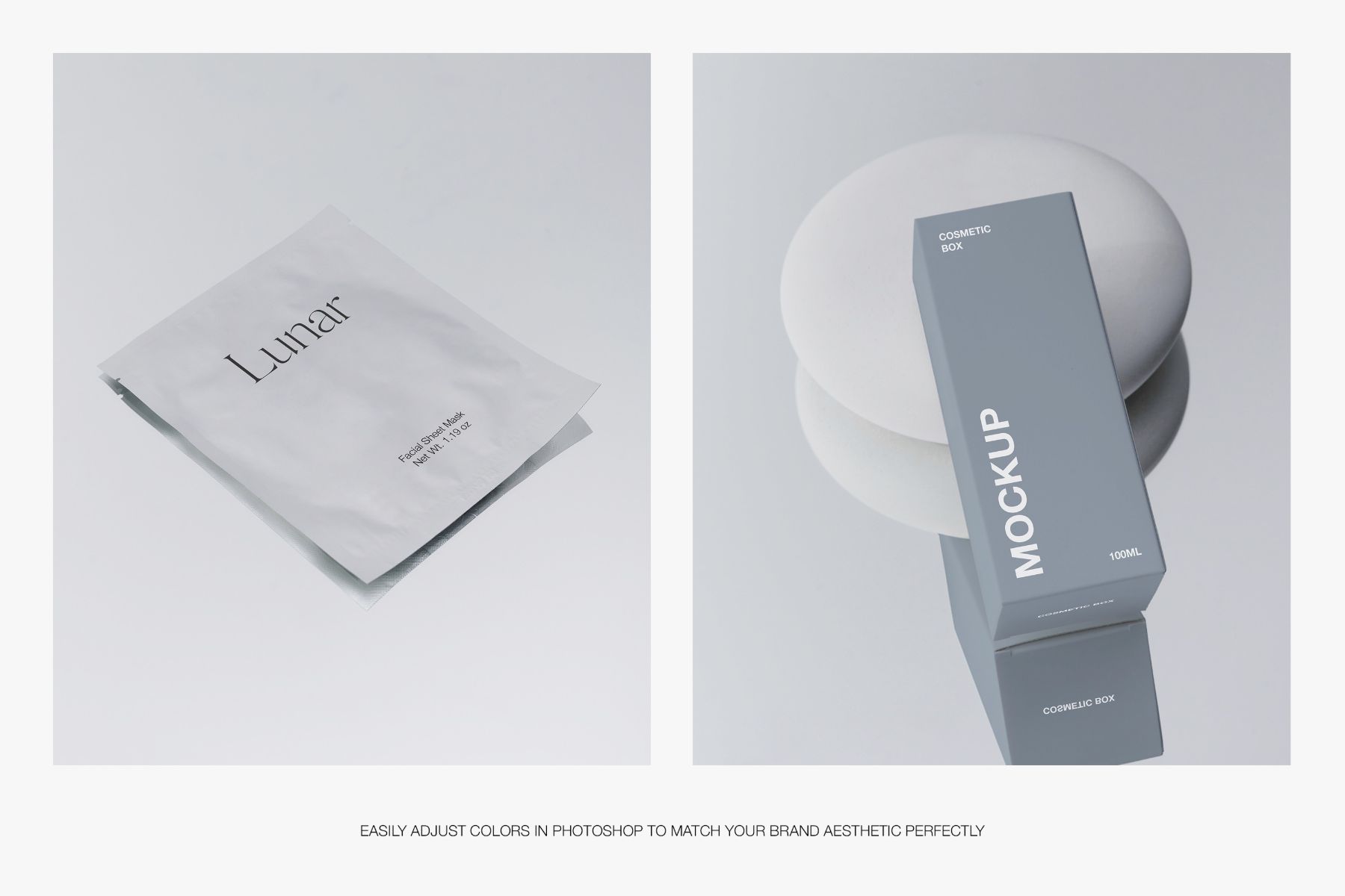 Cosmetic Mockups – Featuring hand cream tubes, serum bottles, cosmetic boxes, face wash bottles, and facial sheet masks, all carefully styled for a sleek and professional look.
