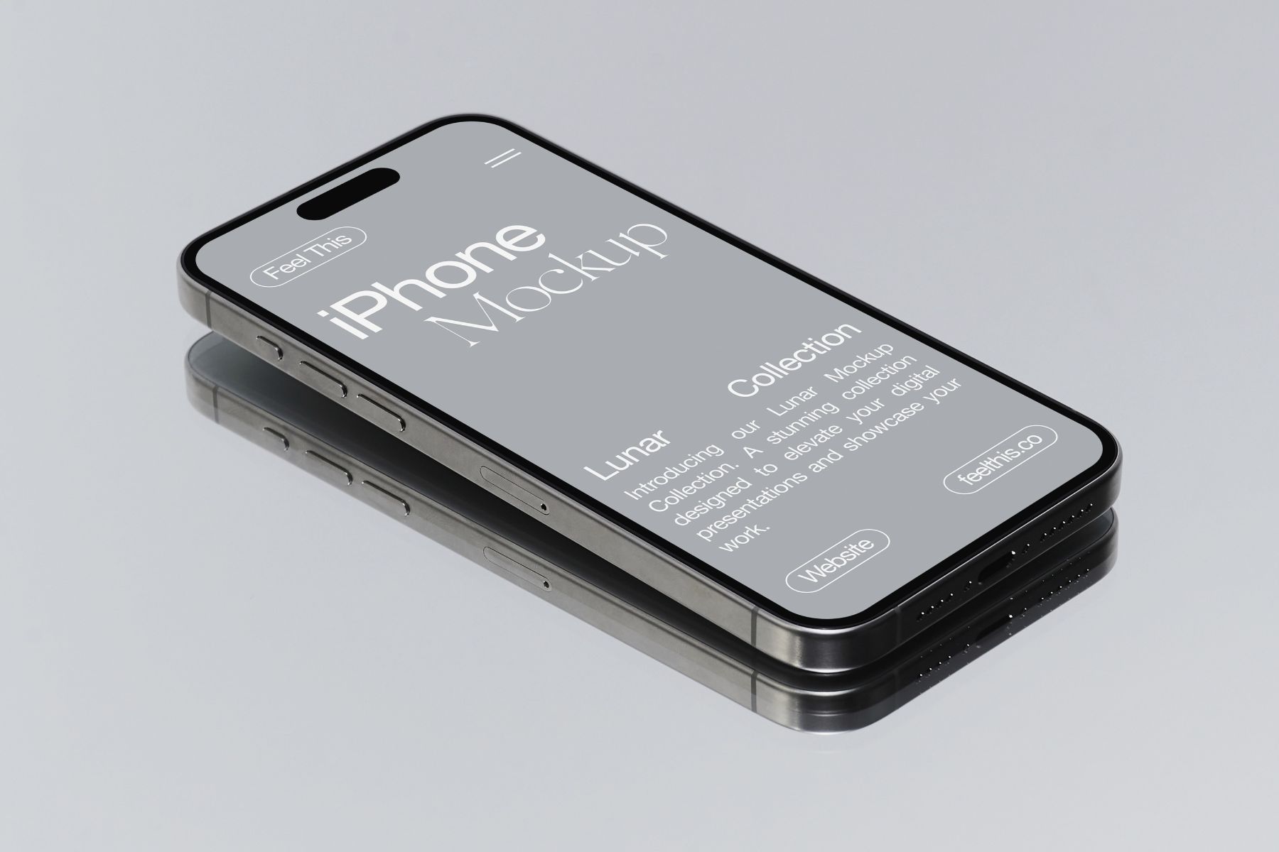 Showcase your mobile app, website, or branding designs with this elegant iPhone 16 Pro mockup, featuring a sleek iPhone set against a neutral grey aesthetic with a polished mirror reflection. This high-quality mockup is perfect for creating refined, professional presentations that highlight your digital designs with a modern touch.