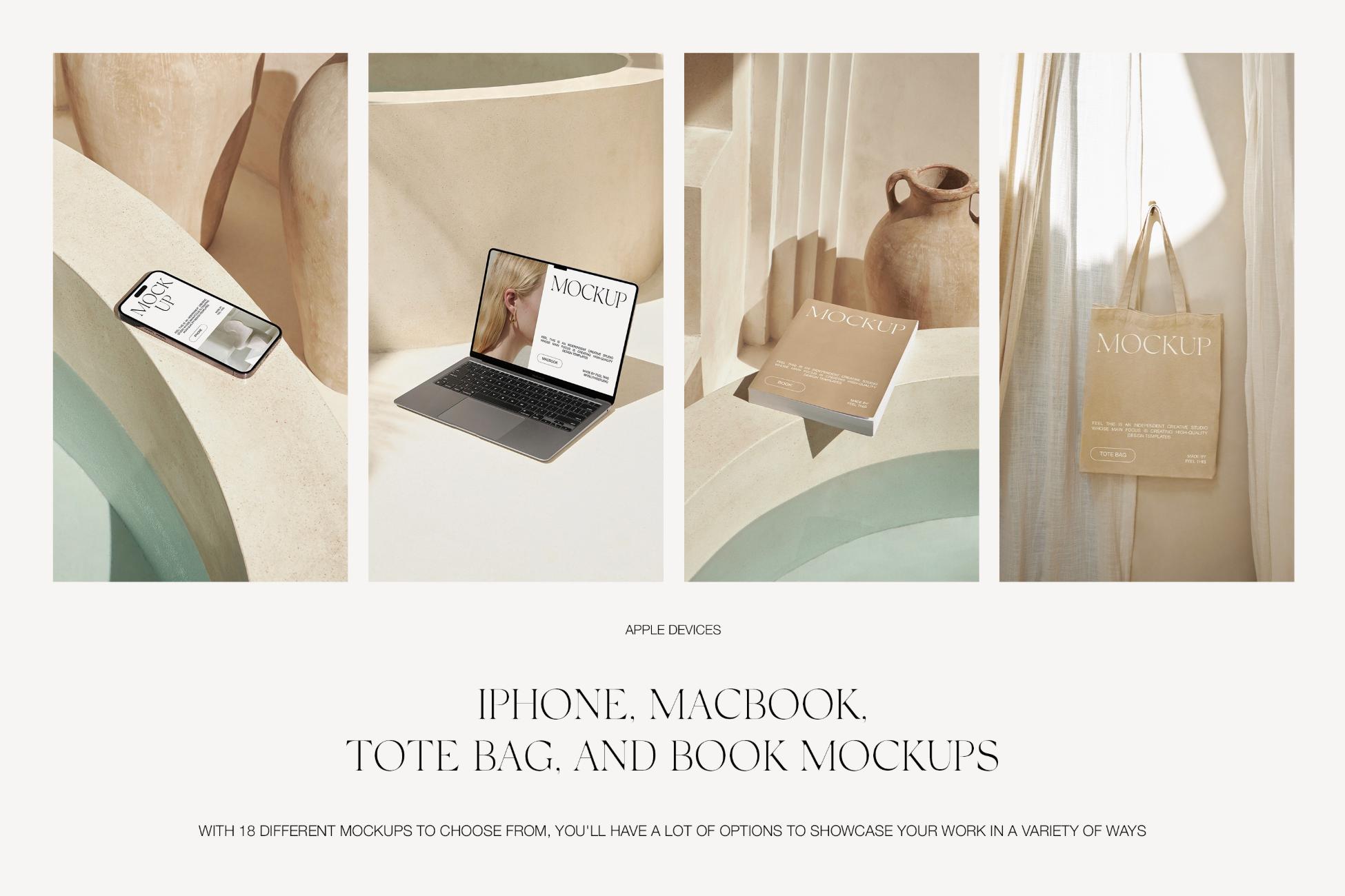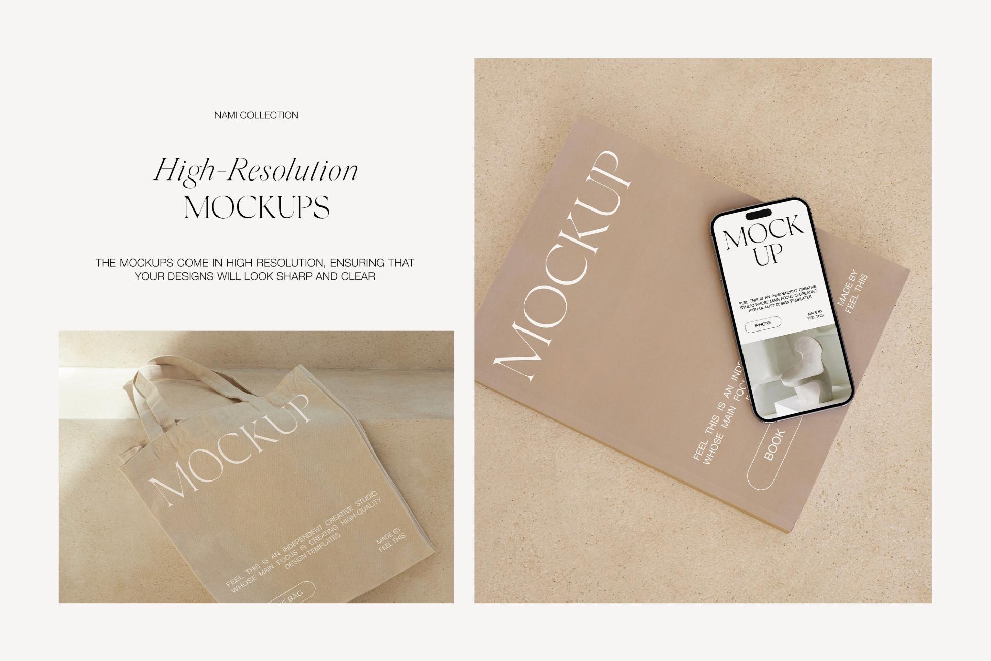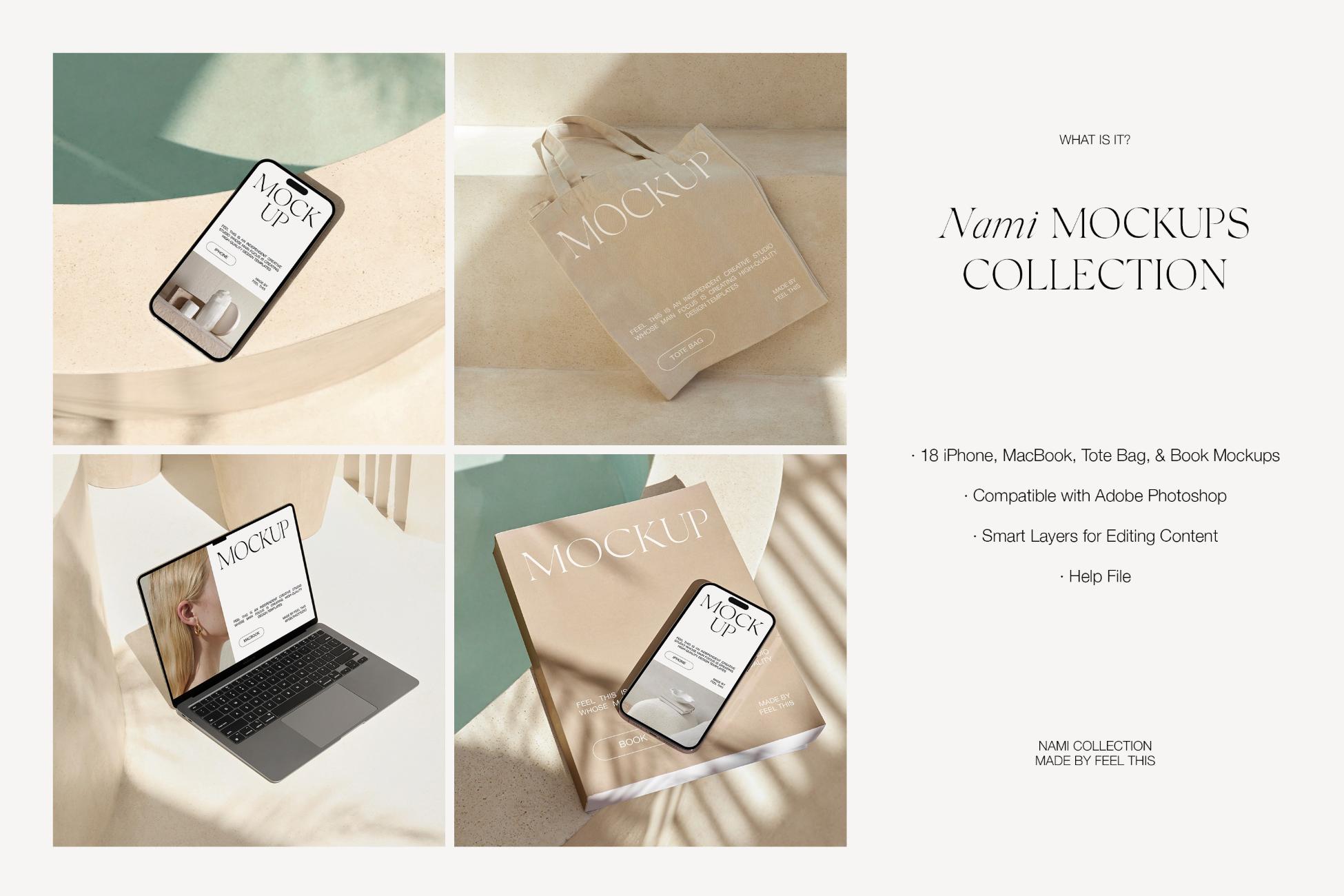 Nami is a collection of 18 customizable MacBook Air, iPhone 14 Pro, Tote Bag, Book mockups for Adobe Photoshop.
