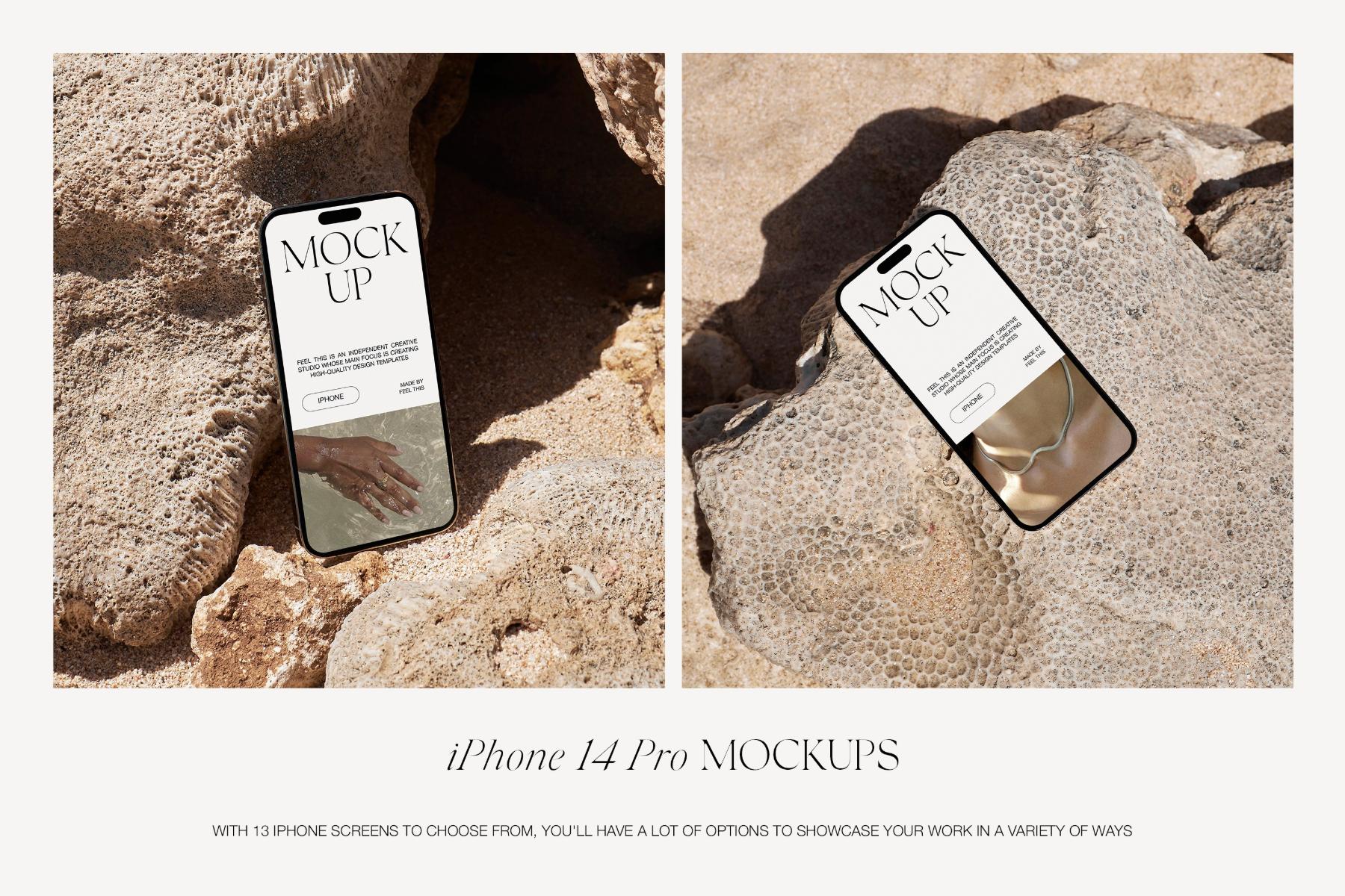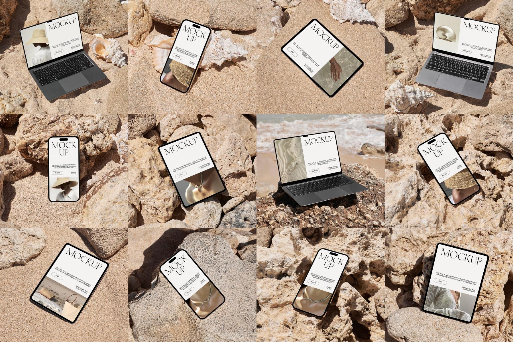 Imagine captivating your clients with breathtaking mockups that transport them to sandy beaches, where the gentle waves meet the shore and seashells whisper tales of inspiration. This carefully crafted bundle features a collection of 34 iPhone 14 Pro, iPad Air, and MacBook Air mockups, meticulously designed on the sun-kissed beaches to elevate your designs and captivate your audience.