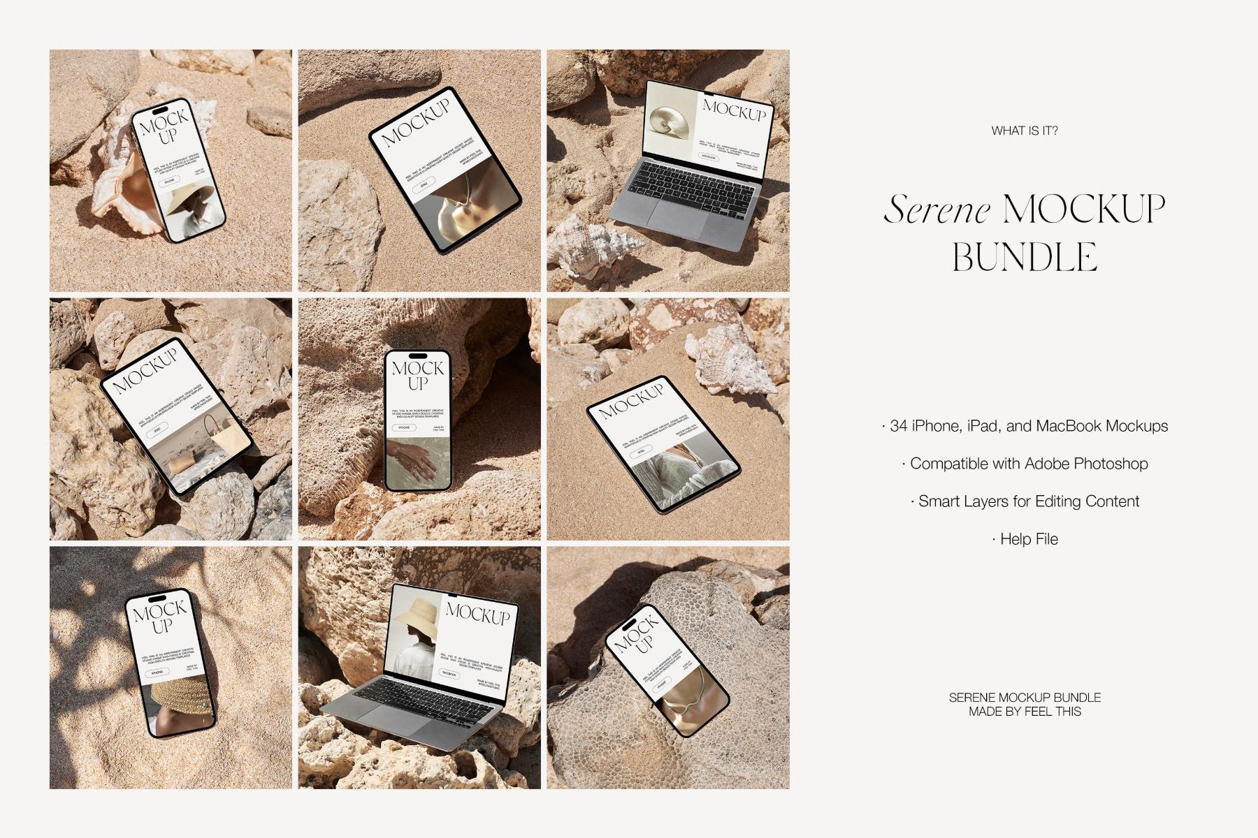 Featuring a variety of angles, perspectives, and device combinations, our bundle offers unparalleled versatility to cater to your unique vision. Don't miss out on this incredible opportunity to transform your work into a masterpiece. Grab your copy of Serene Mockup Bundle now and unlock a world of endless inspiration!