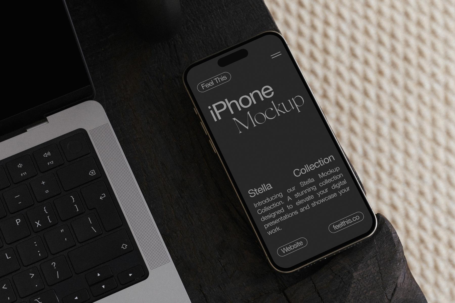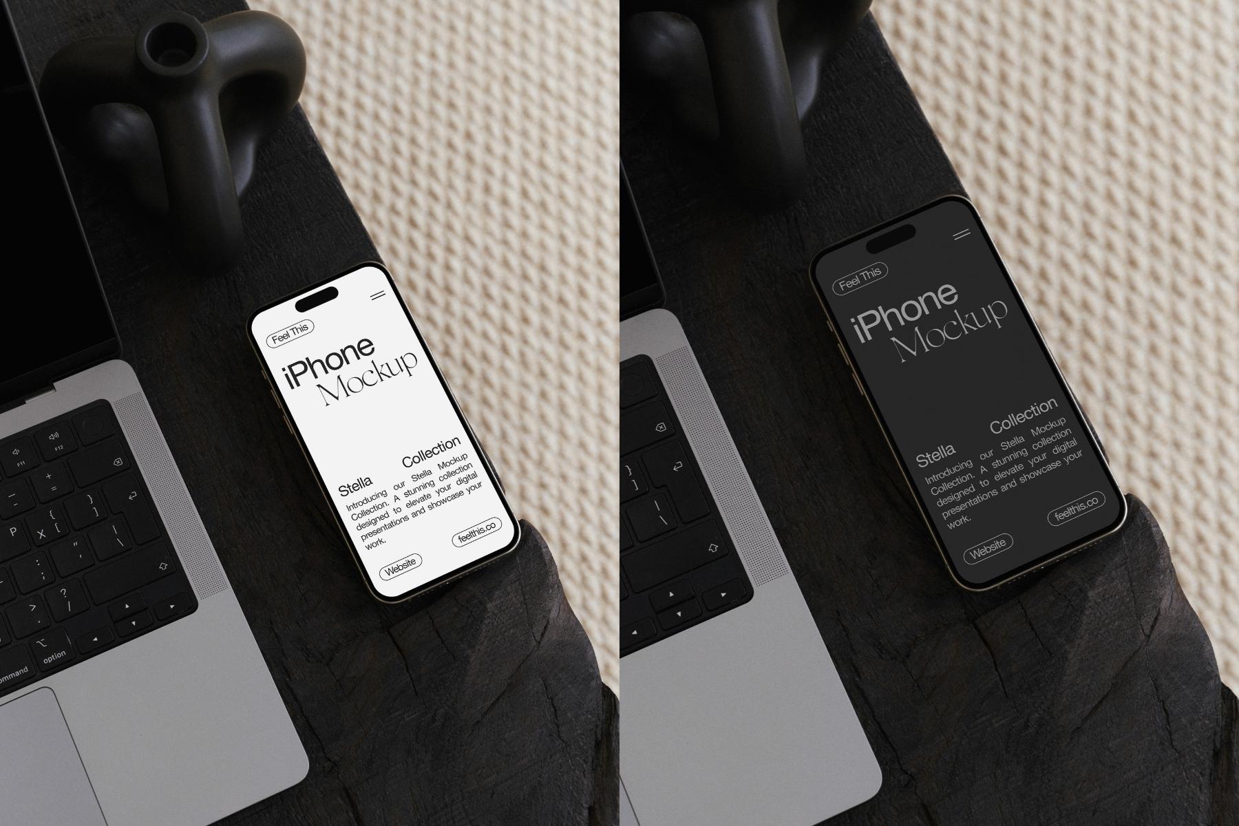 This iPhone mockup is part of the Stella Mockup Bundle, which includes 15 mockups featuring MacBooks, coffee cups, lighters, iPhones, and books in various styles.