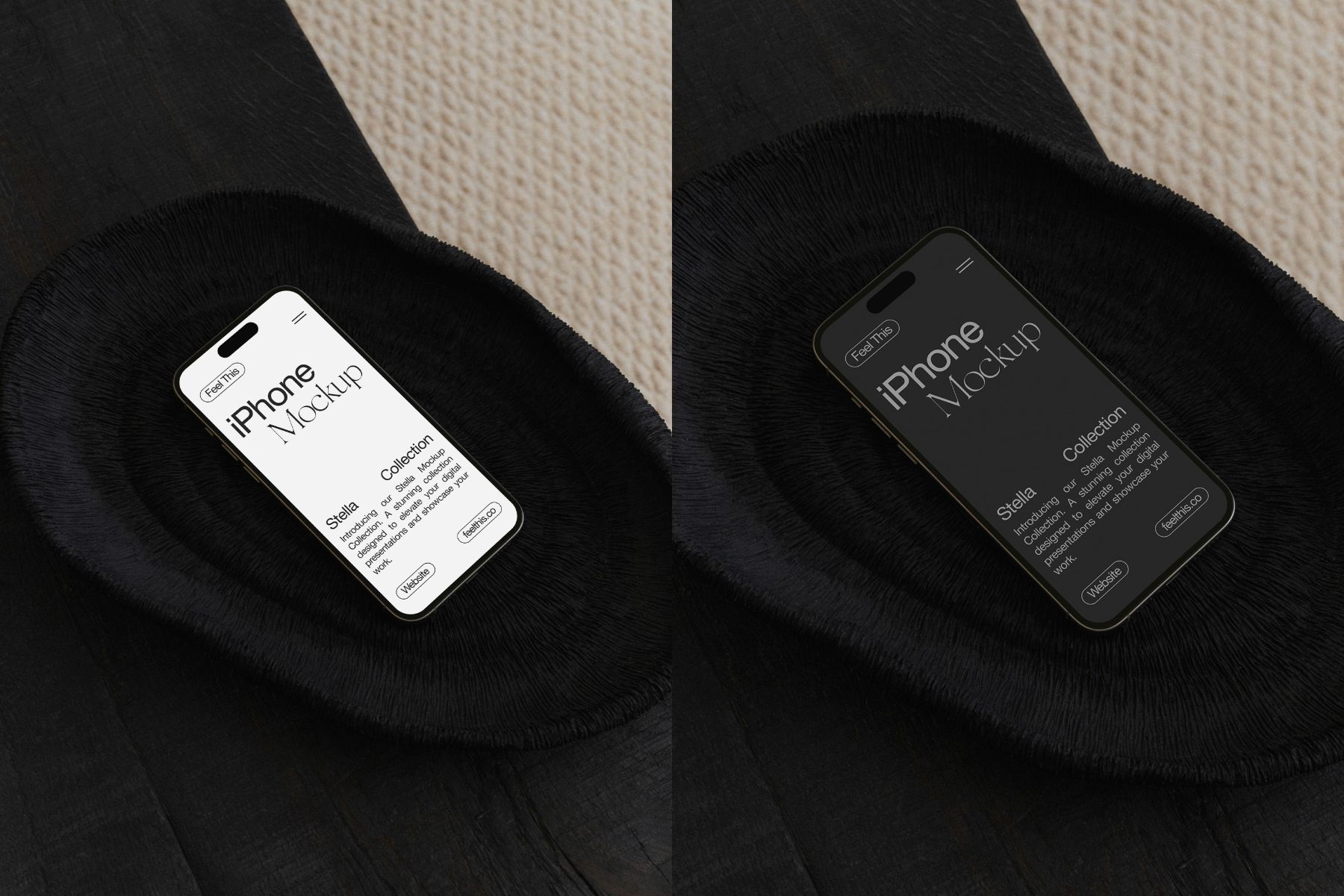 This iPhone mockup is part of the Stella Mockup Bundle, which includes 15 mockups featuring MacBooks, coffee cups, lighters, iPhones, and books in various styles.