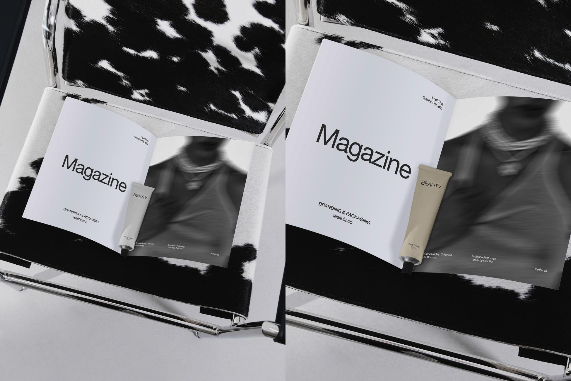 Packaging designers: Easily showcase your latest cosmetic design on a photorealistic tube and magazine.
