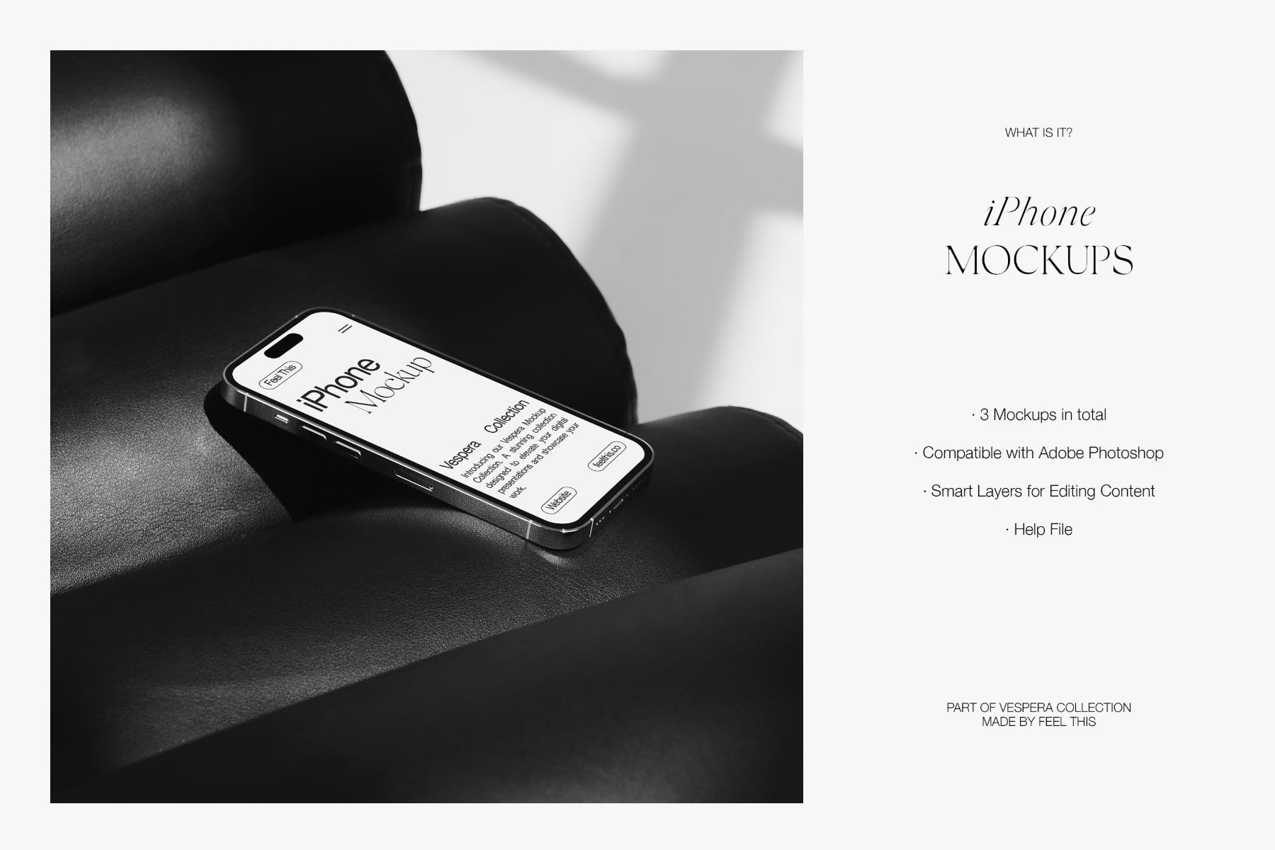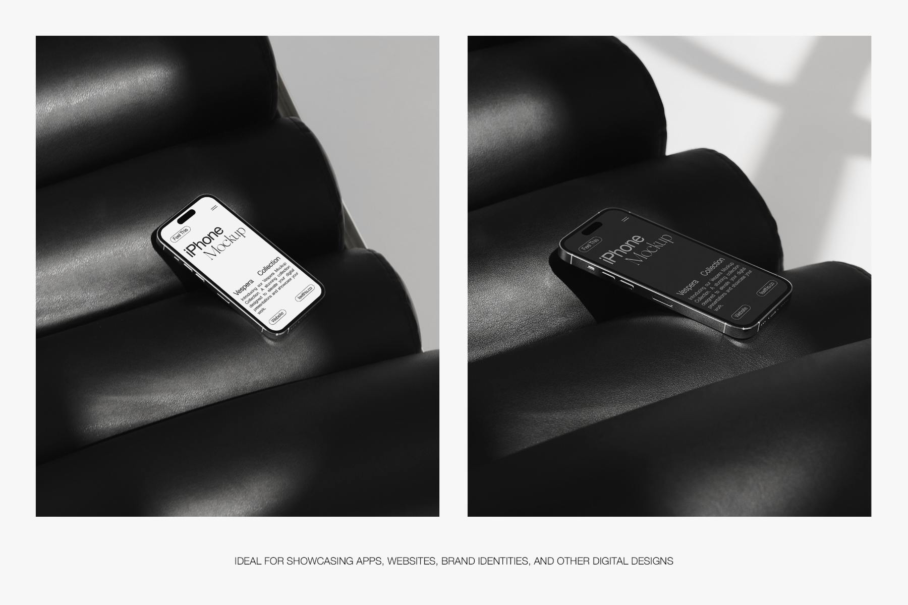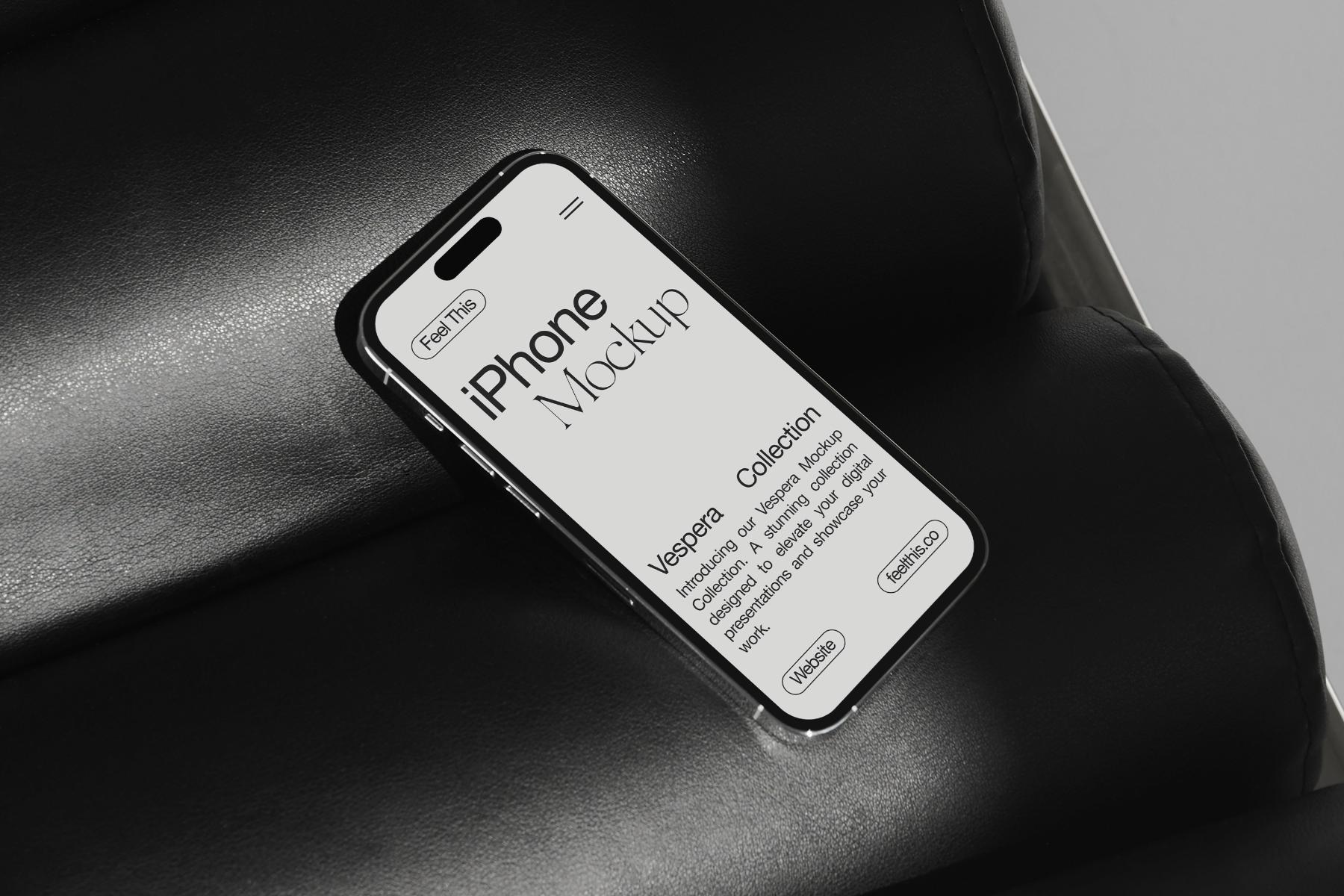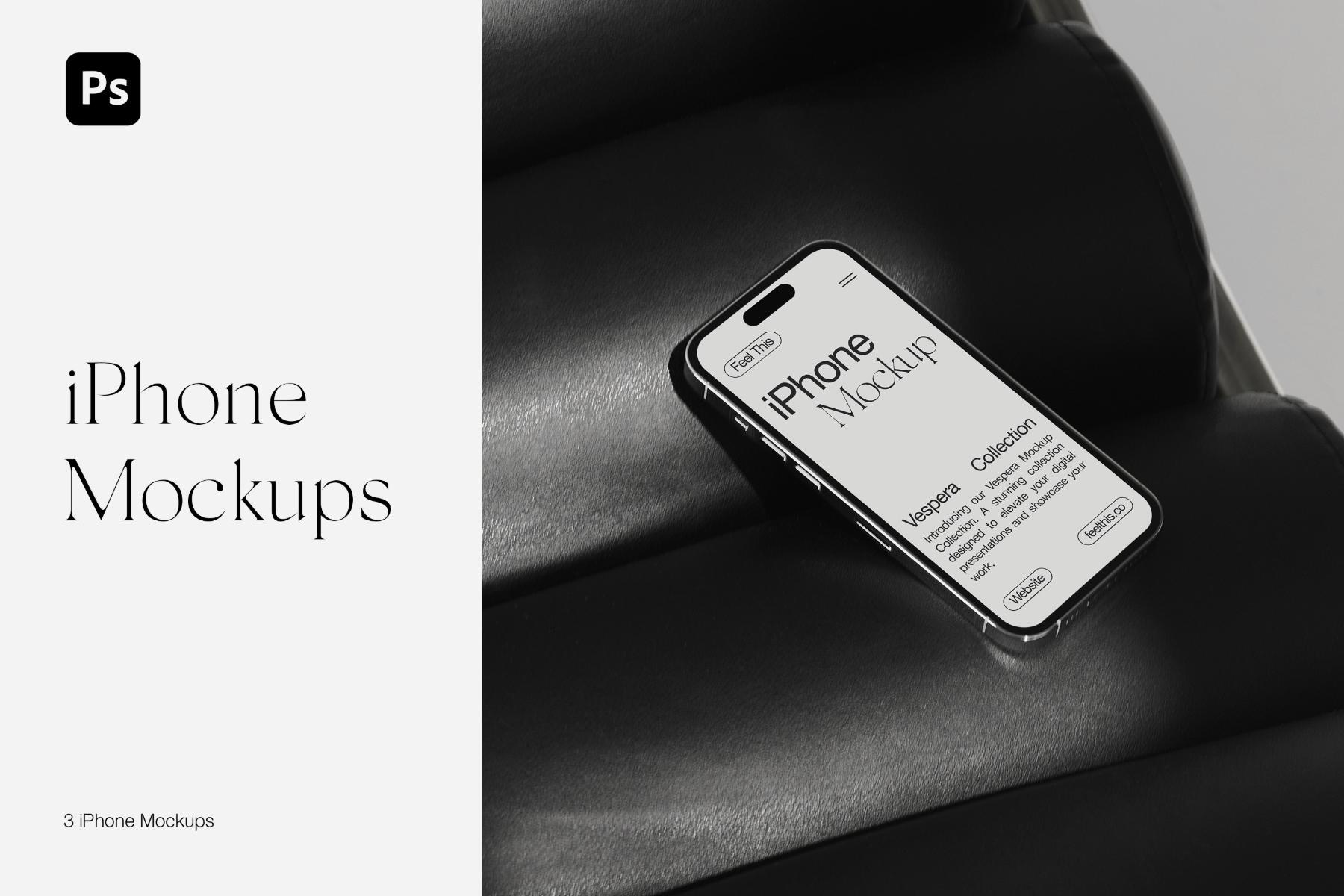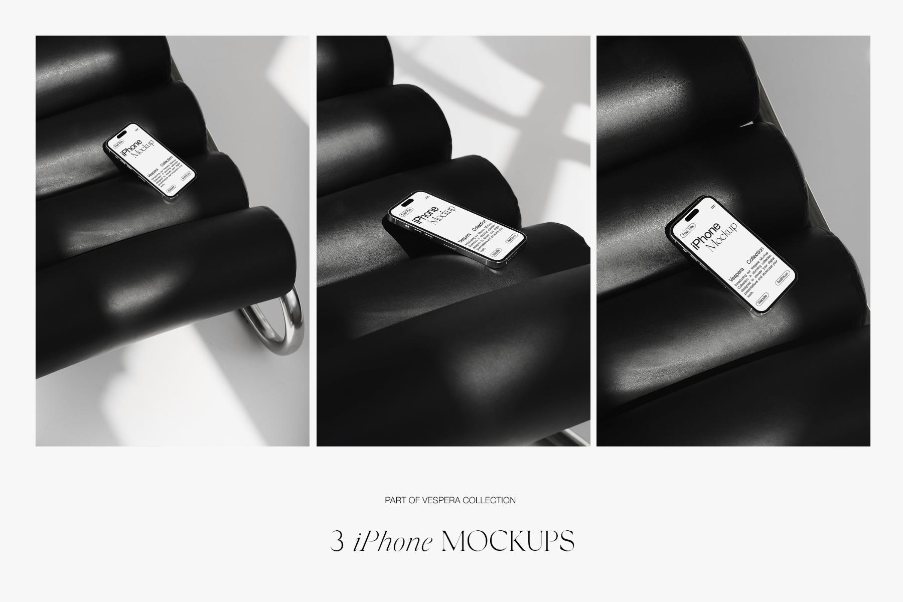 Introducing a curated collection of iPhone mockups aesthetically displayed on a sleek black armchair, offering a versatile canvas for your digital designs. This collection embodies a fusion of contemporary elegance and creative possibility, providing designers with a range of editable Photoshop mockups to elevate their presentations.